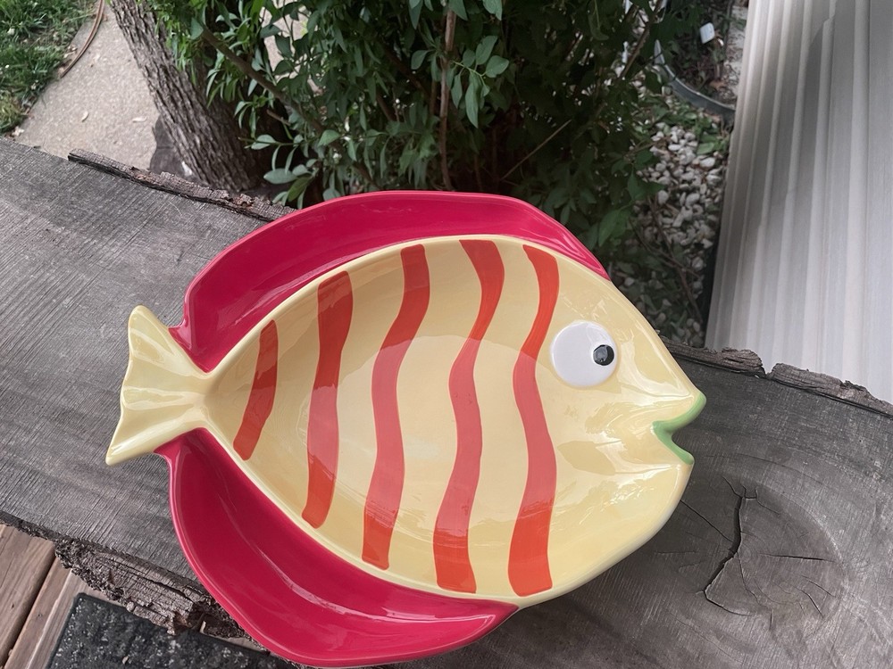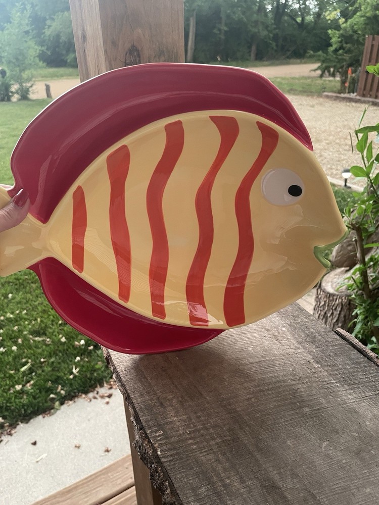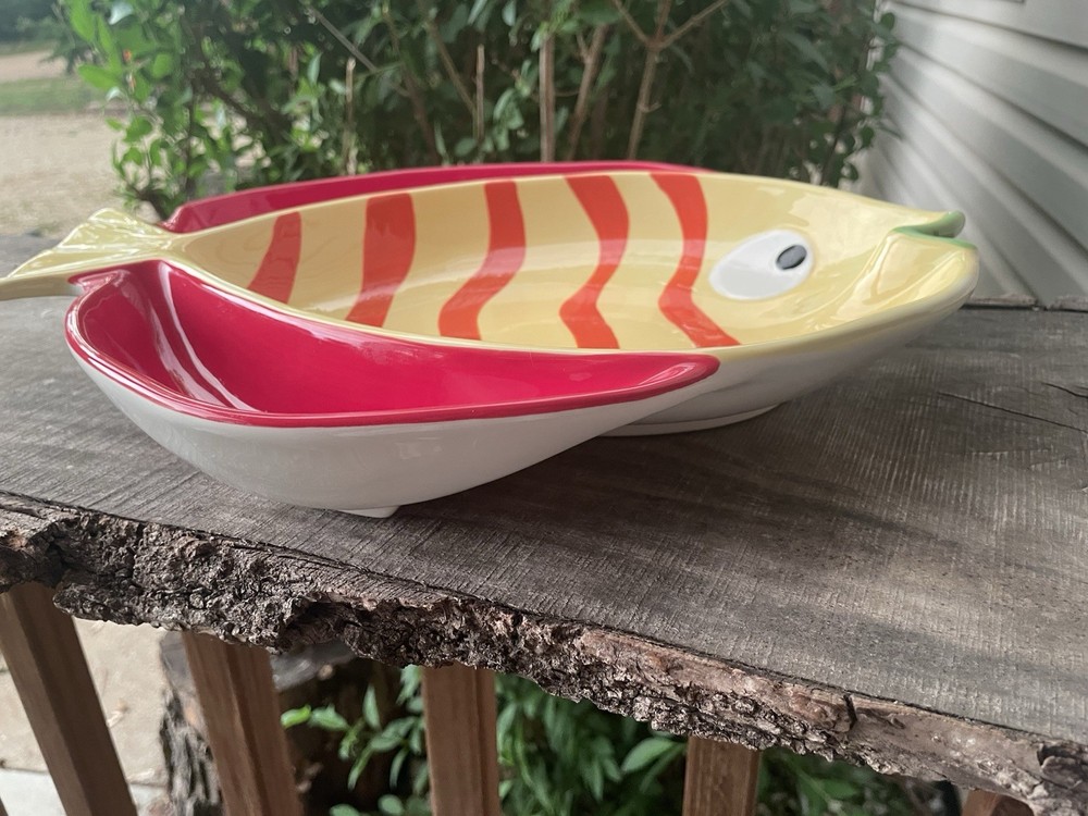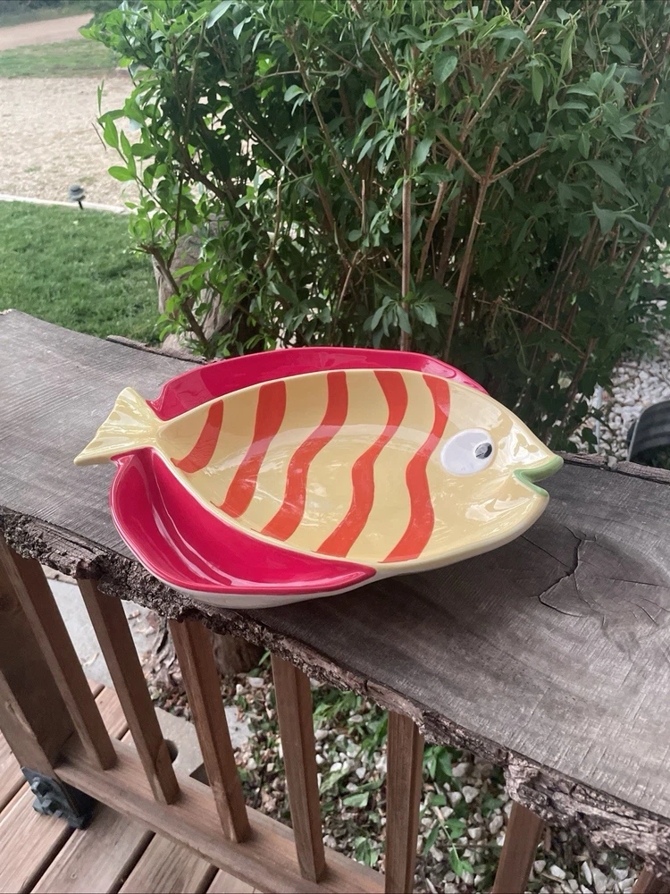 Enhance your party experience with the Summer Living Large Ceramic Fish Shaped Chip & Dip Server. This contemporary styled platter features an all-over multicolor fish pattern, providing a fun and chic way to serve your favorite snacks. The dish is made of high-quality ceramic material, making it microwave and dishwasher safe. It has three compartments, making it easy to organize your chips and dips. The platter is easy to fill and has a glossy finish, adding a touch of elegance to your table. Ideal for all occasions, this 14.5-inch long and 12-inch wide platter weighs 3 lbs. 3 oz. and has a depth of 1.5-2 inches. Platter is preowned, but in excellent condition no damage.