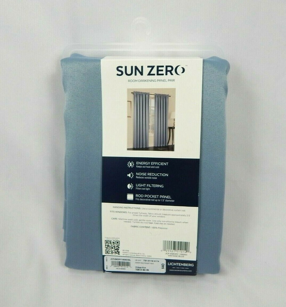 Sun Zero 2-Pack Vintage Blue Emory Room Darkening Rod-Pocket Curtain Panels. Energy efficient curtains keep out heat and cold. Noise reduction and light filtering. Rod pocket panel fits rods up to 1.5" inch diameter. Machine washable. Material: 100% Polyester Dimensions of Each Panel: 54" in. x 63" in. home-5/6