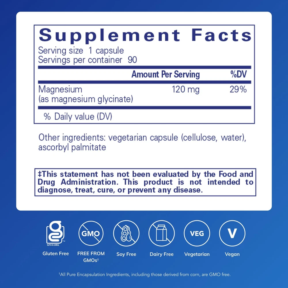 Product Page Pure Encapsulations Magnesium (Glycinate) - Supplement to Support Stre Health and Beauty Description: Features: Heart Health Supplements: This magnesium glycinate capsule activates the enzymes necessary for neuromuscular contractions, cardiac function, and more* Energy & Bone Support: Magnesium supports metabolism of carbs and amino acids; supports energy production and use of calcium, phosphorus, sodium, and potassium* Overall Health & Nutrient Metabolism: This magnesium glycinate supplement helps the metabolism and utilization of vitamin B6, vitamin C, vitamin E, and more* Sleep & Relaxation Aid: Magnesium glycinate may help to support the sleep cycle and aid a sense of relaxation by increasing total dietary magnesium intake daily* Pure Difference: Our supplements are made with premium ingredients sourced from trusted suppliers, then manufactured and tested to verify potency and purity; Pure Encapsulations products are free from common allergens, unnecessary binders, fillers, and preservatives, and GMOs