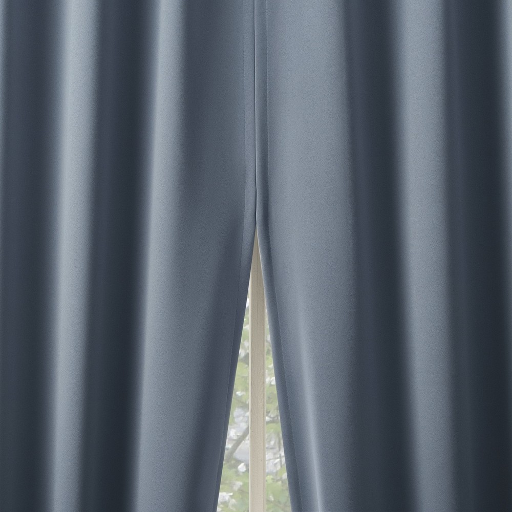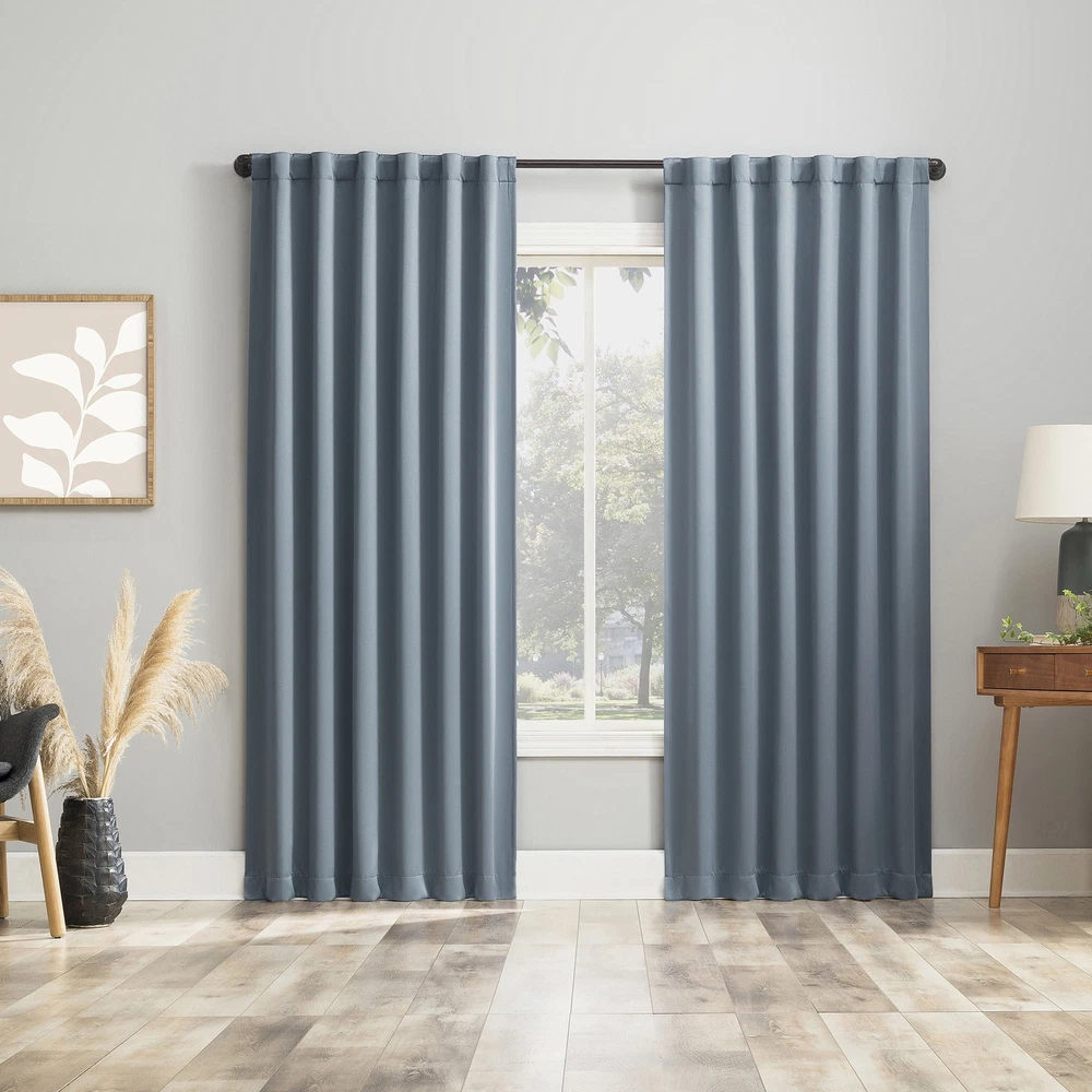 Product details Sun Zero Aria Curtain Panel Pairs provide the ultimate in light blocking technology coupled with magnetic closures to keep out even the harshest of light while bringing an elegant urban sophistication to any room of your home. Sun Zero Extreme Blackout technology is laboratory tested to block out 100% of light, reduce outside noise by up to 45%, and decrease energy lost through your windows by up to 50%. Comfort is optimized with thermal properties that help keep summer heat and winter chill out of your home. Hidden back tabs allow for easy slide-through installation on curtain rods up to 1.5" in diameter. Hang in your entertainment room to eliminate screen glare and reduce distracting outside noise, or in your bedroom for enhanced privacy and a sounder, more uninterrupted sleep. Pair includes 2 panels measuring 104" width by 96" length. Measure carefully before selecting your desired size and quantity. Machine wash cold on gentle cycle. Use non-chlorine bleach when needed. Tumble dry on low heat, using a cool iron as needed. Extreme Blackout technology with magnetic closure blocks out 100 percent of outside light Energy Efficient design reduces energy lost through your windows by up to 50 percent Thermal properties help keep summer heat and winter chill out of your home Noise reduction by up to 45 percent helps you get a sounder, more uninterrupted sleep Hidden back tabs fit curtain rods up to 1.5" in diameter Pair includes two (2) panels measuring 52" w each. Measure carefully prior to purchase. Curtain rod not included. Double rod may be needed for layering.