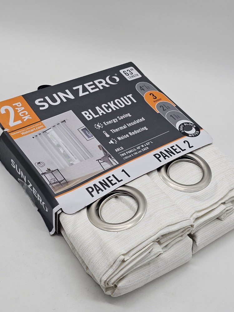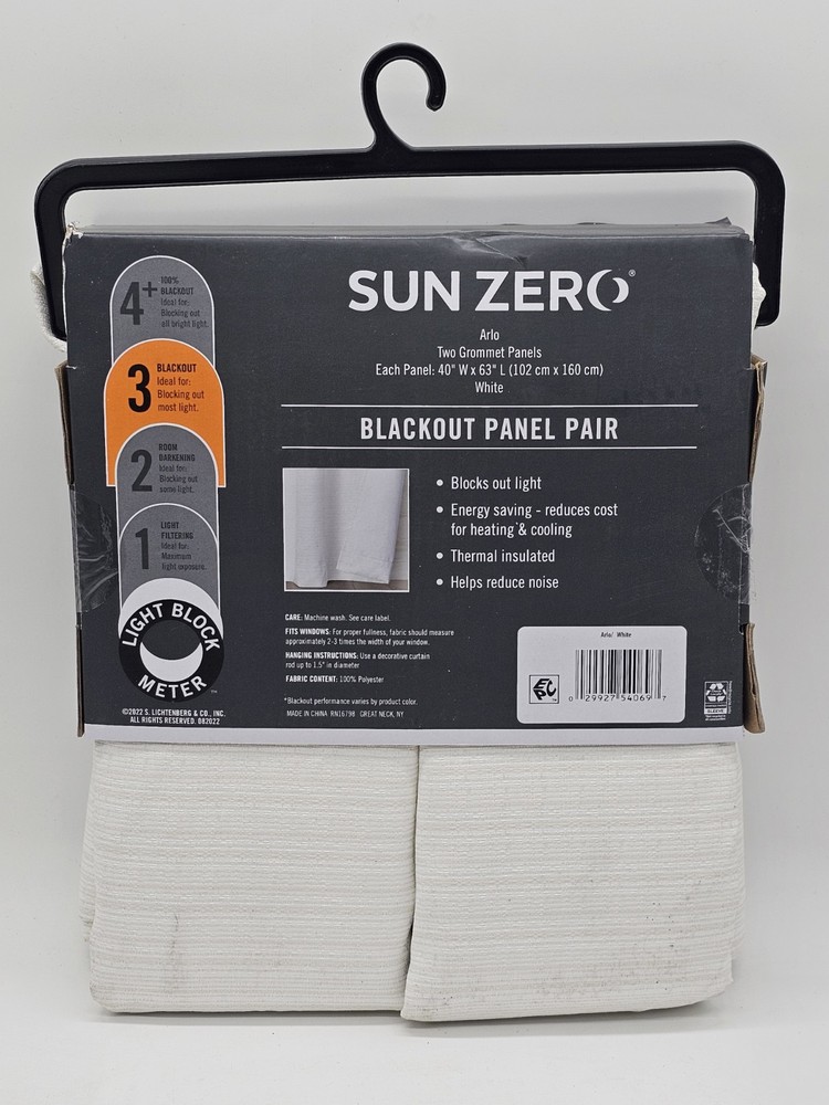 Sun Zero Arlo Textured Blackout White Curtains Panel 2-pack offers noise-reducing and blackout features. The curtains have a gray color with a textured pattern, made of polyester material for indoors. They have grommets for curtain heading and measure 40 inches in width and 63 inches in length, suitable for any room. M431 GG