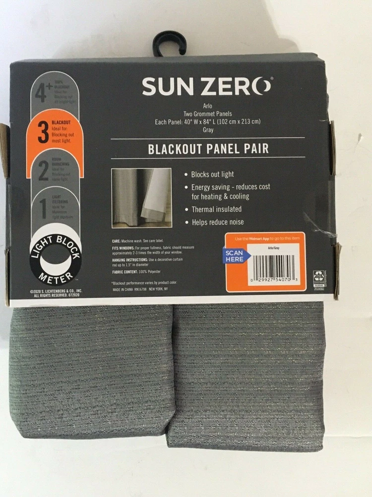 WE DO NOT SHIP TO P.O. BOXES. PLEASE PROVIDE A PHYSICAL MAILING ADDRESS. NEW. NEVER USED Item will be shipped free by USPS Priority Mail/UPS within 48 Lower States (NO SHIPPING for Alaska, Hawaii or Puerto Rico) Sun Zero 2-pack Arlo Textured Thermal Insulated Curtain Panel Pair offers energy efficiency and elevated design with a woven texture complemented with built-in grommets for easy hanging on any standard curtain rod up to 1.5" in diameter. Sun Zero Thermal Insulated Curtains are laboratory tested to significantly reduce light exposure, offer outside noise reduction by up to 25%, and decrease energy lost through your windows by up to 40%. Comfort is optimized with thermal properties that help keep summer heat and winter chill out of your home. Hang in your living room for enhanced privacy, or in your bedroom for a sounder, more uninterrupted sleep. Includes 2 curtain panels for a complete window. Unique woven textured design with Thermal Insulated Blackout technology Energy Efficient design reduces energy lost through your windows by up to 40% Thermal insulation helps you keep your summer heat and winter chill out of your home Noise reduction helps you get a sounder, more uninterrupted sleep Built-in rod pocket design allows easy hanging on any curtain rod up to 1.5" in diameter Includes 2 curtain panels for a complete look Curtain rod not included. Double rod may be needed for layering.
