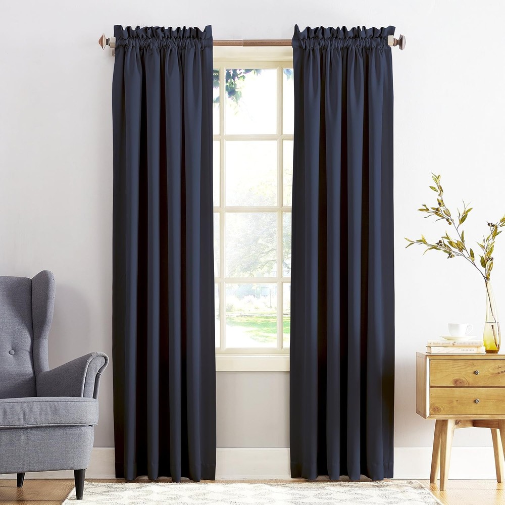 Sun Zero Barrow Energy Efficient Rod 54"W x 95"L (Pack of 2), Navy Blue Product Details Brand: Sun Zero Color: Navy Blue Material: Polyester Product Dimensions: 95"L x 54"W Opacity: Blackout Special Feature: Uv Protection, Noise Reduction Room Type: Living Room Style: Curtain Pattern: Solid Theme: Space Top Style: Rod Pocket Size: 54"W x 95"L (Pack of 2) Recommended Uses For Product: Indoor Seasons: Winter Hanging Method: Rod Pocket Item Weight: 1.02 Kilograms Closure Type: Rod pocket Number of Items: 2 Lining Description: Lined Package Weight: 1.02 Kilograms Water Resistance Level: Not Water Resistant Unit Count: 2.0 Count Compatible with Rod Size: 1.5 Inches Indoor/Outdoor Usage: Indoor Model Name: Barrow Collection UPC: 029927615098 Manufacturer: Sun Zero Item Weight: 2.24 pounds Department: Home Item model number: 11042 Item Package Dimension: 10.2L x 7.8W x 3.5H inches Item Package Weight - 2.2 Pounds Item Package Quantity - 1 Product Type - CURTAIN By combining the latest fashion trends with breakthrough performance technology, Sun Zero blackout curtains offer the best control of your home environment without compromising on style. These curtains are built with UPF 50+ UV protection, which helps shield them from the sun’s harmful rays. These energy efficient black out curtains offers noise reduction to keep the noise and chill out of your home this fall and winter.