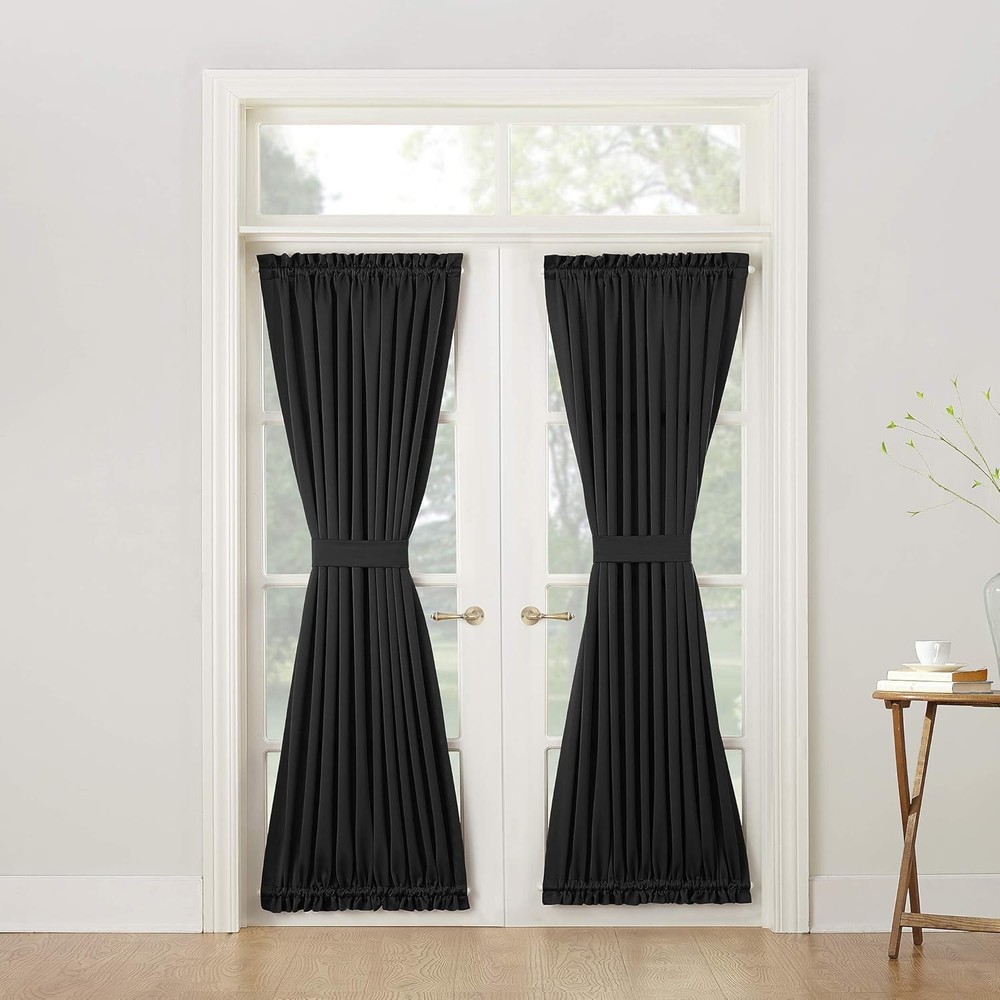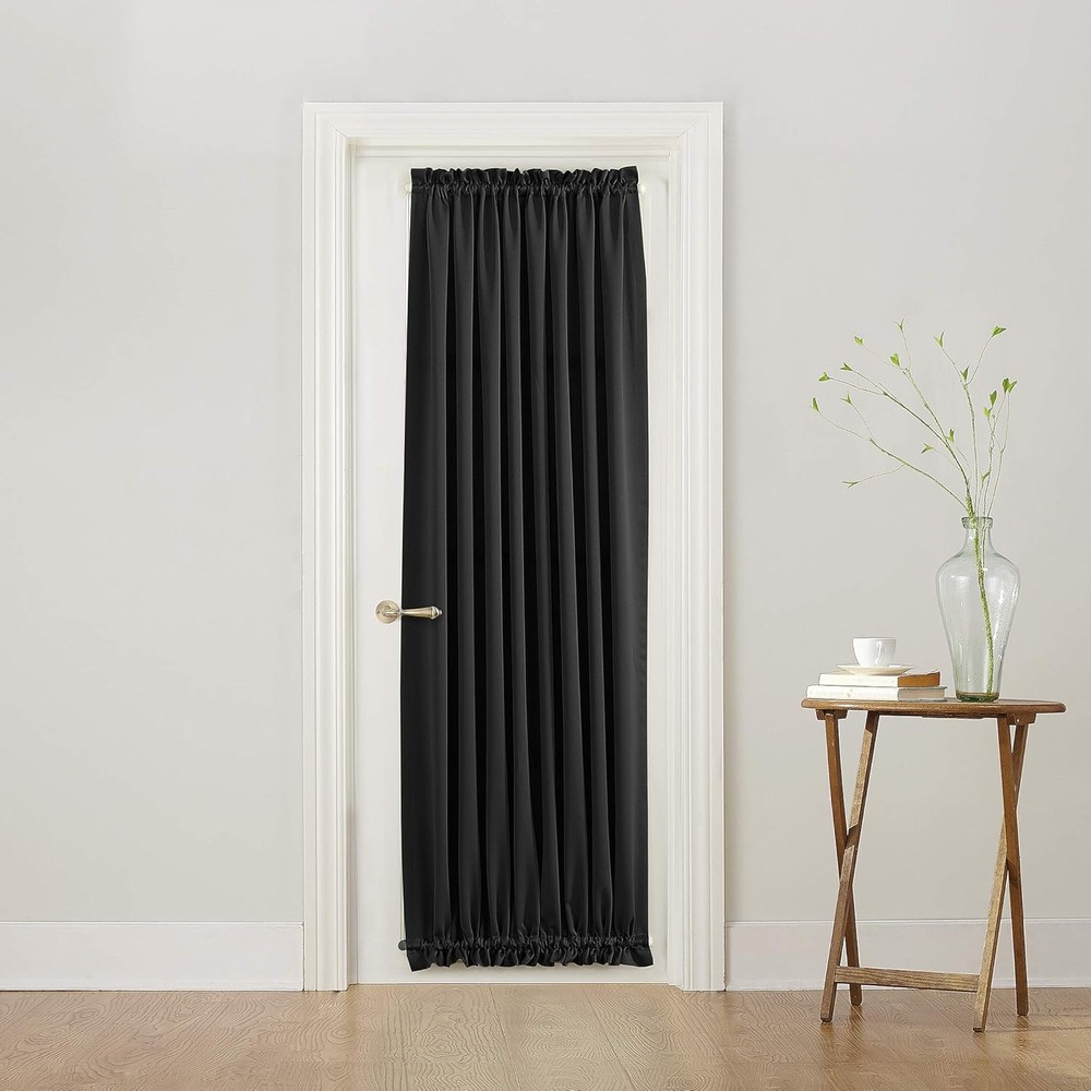 Sun Zero Barrow Energy Efficient Rod Pocket 54"W x 72"L (Pack of 1), Black Product Details Brand: Sun Zero Color: Black Material: Polyester Product Dimensions: 72"L x 54"W Opacity: Room-darkening Special Feature: Rod Pocket Room Type: Living Room Style: Door Curtain Pattern: Solid Theme: Fashion Curtain Form: Door Panel Curtain Top Style: Rod Pocket Size: 54"W x 72"L (Pack of 1) Included Components: Tie Back Recommended Uses For Product: Indoor Weave Type: Plain Seasons: Summer Hanging Method: Rod Pocket Item Weight: 13.28 ounces Closure Type: Tie Number of Items: 1 Product Care Instructions: Machine Wash Lining Description: Polyester Package Weight: 0.44 Kilograms Fabric Type: 100% Polyester Unit Count: 1.0 Count Compatible with Rod Size: 1.5 Inches Global Trade Identification Number: 00029927474053 Model Name: 1 UPC: 029927474053 Manufacturer: Lichtenberg Item Weight: 13.3 ounces Country of Origin: China Item model number: 47405 Ideal solution for doors, includes a tie-back for optimal light control Room Darkening technology blocks out some unwanted light while enhancing privacy Energy efficient design reduces energy lost through your windows by up to 25% Thermal properties help keep summer heat and winter chill out of your home Noise reduction up to 25% helps you get a sounder, more uninterrupted sleep.Built-in rod pocket fits curtain rods up to 1.5" in diameter Sun Zero Barrow Door Panel Room Darkening door panel brings style and energy efficiency to any home. The woven solid design with an easy to hang rod pocket offers a classic style that fits in with any room decor while reducing light and noise for better sleep; help keep your home cooler in the summer and warmer in the winter. Room Darkening panels are made of materials that reduce light, and considerably darken the room. Some light will show through. These materials do not allow a view through and provide complete privacy. The darker the color the better the light reducing capabilities. Sold individually. Hang on a rod up to 1.5" in diameter. Polyester. Washable. Imported.