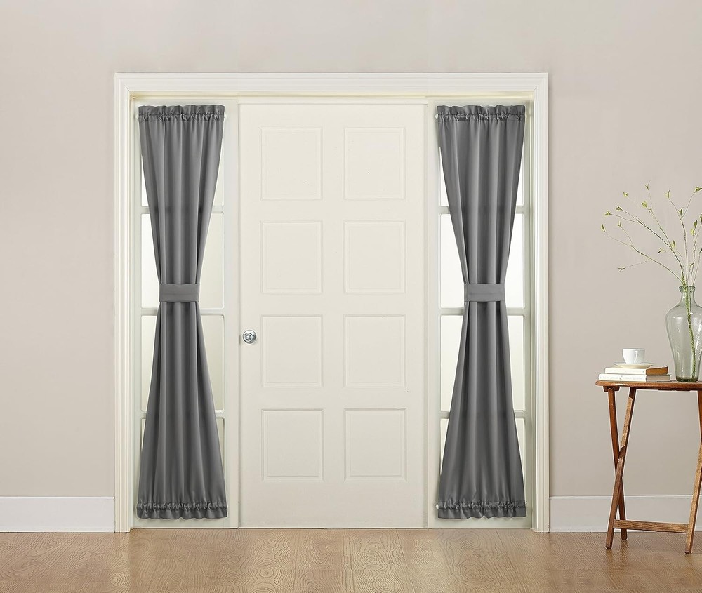 About this item Ideal solution for front doors, includes a tie-back for optimal light control Room Darkening technology blocks out some unwanted light while enhancing privacy Energy efficient design reduces energy lost through your windows by up to 25% Thermal properties help keep summer heat and winter chill out of your home Noise reduction up to 25% helps you get a sounder, more uninterrupted sleep Built-in rod pocket fits curtain rods up to 1.5" in diameter