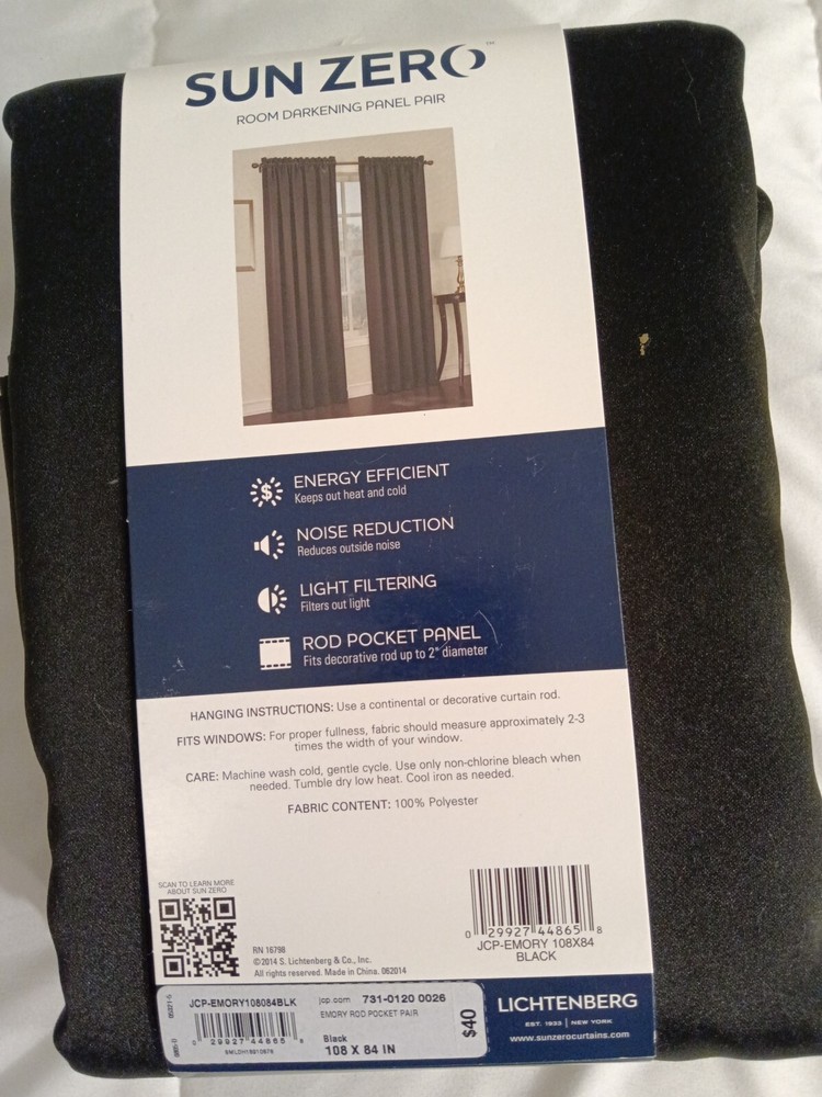 Sun Zero Black Emory Room-Darkening RodPocket Curtain Panel Pr. 54"x84"A62. Always free shipping and handling. Thanks for looking....