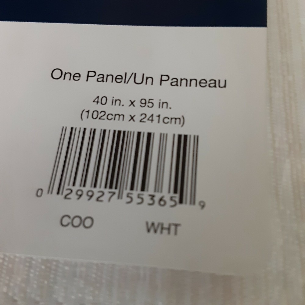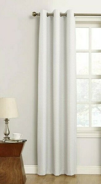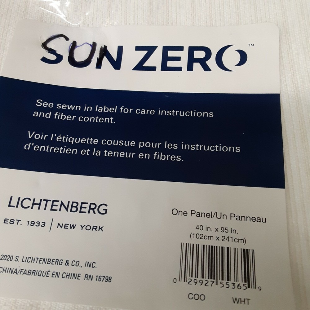 This Sun Zero curtain panel is white with a small faded copper line running across. It has grommets at the top to put your curtain rod thru for hanging. I only have 1 panel. Machine wash cold tumble d...