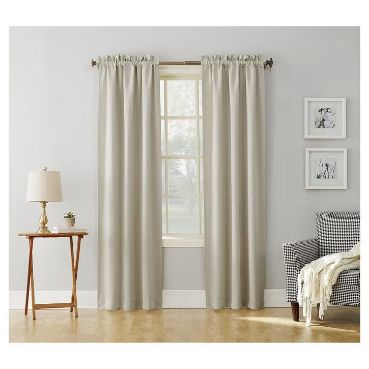 Specifications Number of Pieces: 1 Dimensions (Overall): 63.0 Inches (L), 40 Inches (W) Fabric Name: Plain Weave Textile Material: 100% Polyester Accommodates Pole Size: 1.5 Inches Indoor/Outdoor: Indoor Features: Noise reduction, Energy Efficient Includes: 1 Curtain Panel Required, Not Included: Rod Hanging style: Rod Pocket Light Filtration: Blackout Single Panel Weight: 2 POUND Care & Cleaning: Iron as Needed, Machine Wash, Machine Dry