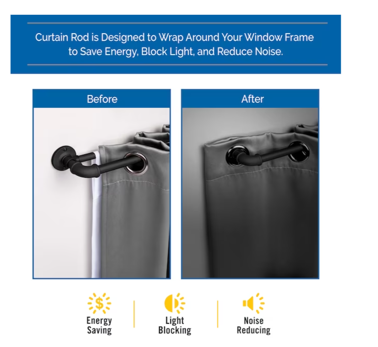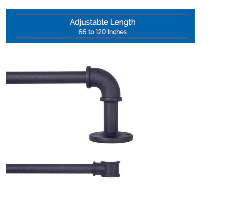 Sun Zero Bronn Industrial 66-in to 120-in Matte Black Steel Double Curtain Rod with Finials The Sun Zero Bronn Industrial 3/4 in. Room Darkening Double Curtain Rod is designed to wrap around your window frame to save energy, block light, and reduce noise. The textured matte black finished industrial styled telescoping pipework steel rod is adjustable from 66-120 in. to fit a variety of window sizes and projects 3.75 in. from the wall. Use on larger windows in larger rooms, like your bedroom, dining room, or living room to hang light, medium, or heavyweight curtains. It is ideal for hanging curtains with grommets and can be used with clip rings. The double rod adds a layered look to your curtains, giving you more control over how much light to let into your room throughout the day and providing more insulation during colder months. To layer, place heavier, decorative curtains on the 3/4 in. diameter front rod and lighter, sheer curtains on the 5/8 in. diameter back rod. Pair with Sun Zero grommet curtain panels (sold separately) to maximize energy saving, light blocking, and noise-reducing features. Room Darkening Rod Set Includes one telescoping steel double curtain rod with two mounting brackets, one center support, screws, drywall anchors, and installation instructions. Sun Zero Bronn Industrial 3/4 inch Room Darkening Double Curtain Rod is designed to wrap around your window frame to save energy, block light, and reduce noise The textured telescoping rod is adjustable in length from 66-120 inches to fit your window and projects 3.75 inches from the wall The 3/4 inch diameter rod is suited for larger windows in larger rooms of your home such as the living room, dining room, or bedroom Pair with Sun Zero grommet curtain panels (sold separately) to maximize energy saving, light blocking, and noise-reducing features Includes: one telescoping double curtain rod with two mounting brackets, one center support, screws, drywall anchors, and installation instructions