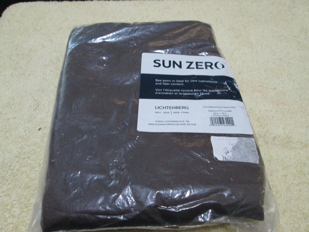 Here's a new open box Sun Zero chocolate polyester 54"x 18" rod pocket room darkening valance. This is new in a open package. Thanks for looking.