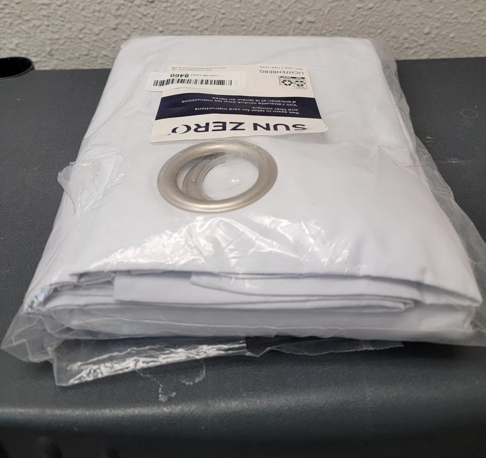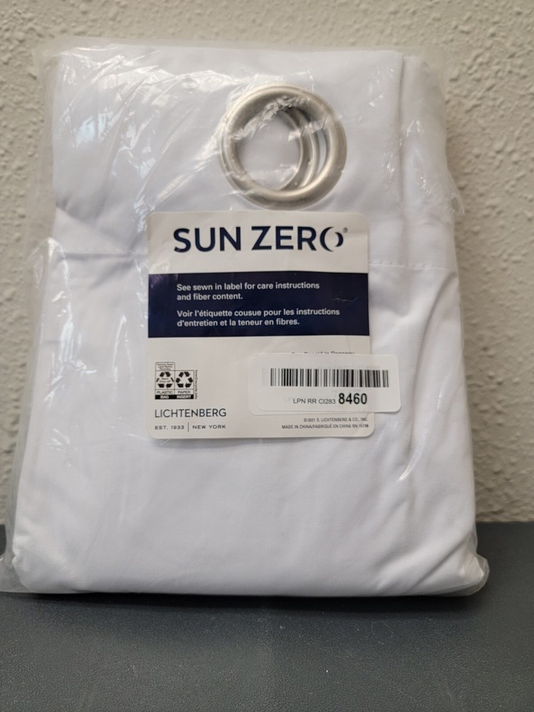 Sun Zero Columbia Insulated 100% Blackout Grommet Curtain Single 50"x108" White. Amazon returned item. New, unused, and folded. No visible damage to it. Product details Brand- Sun Zero Color- White Material- Polyester Product Dimensions- 108"L x 50"W Opacity- Blackout Special Feature- Blackout Total Blackout technology blocks out 100% of outside light while enhancing privacy. Double rod may be needed for layering Thermal insulation helps keep summer heat and winter chill out of your home. Material-100% Polyester Energy efficient design reduces energy lost through your windows by up to 35% Noise reduction up to 35% helps you get a sounder, more uninterrupted sleep Built-in metal grommets fit curtain rods up to 1. 5" in diameter
