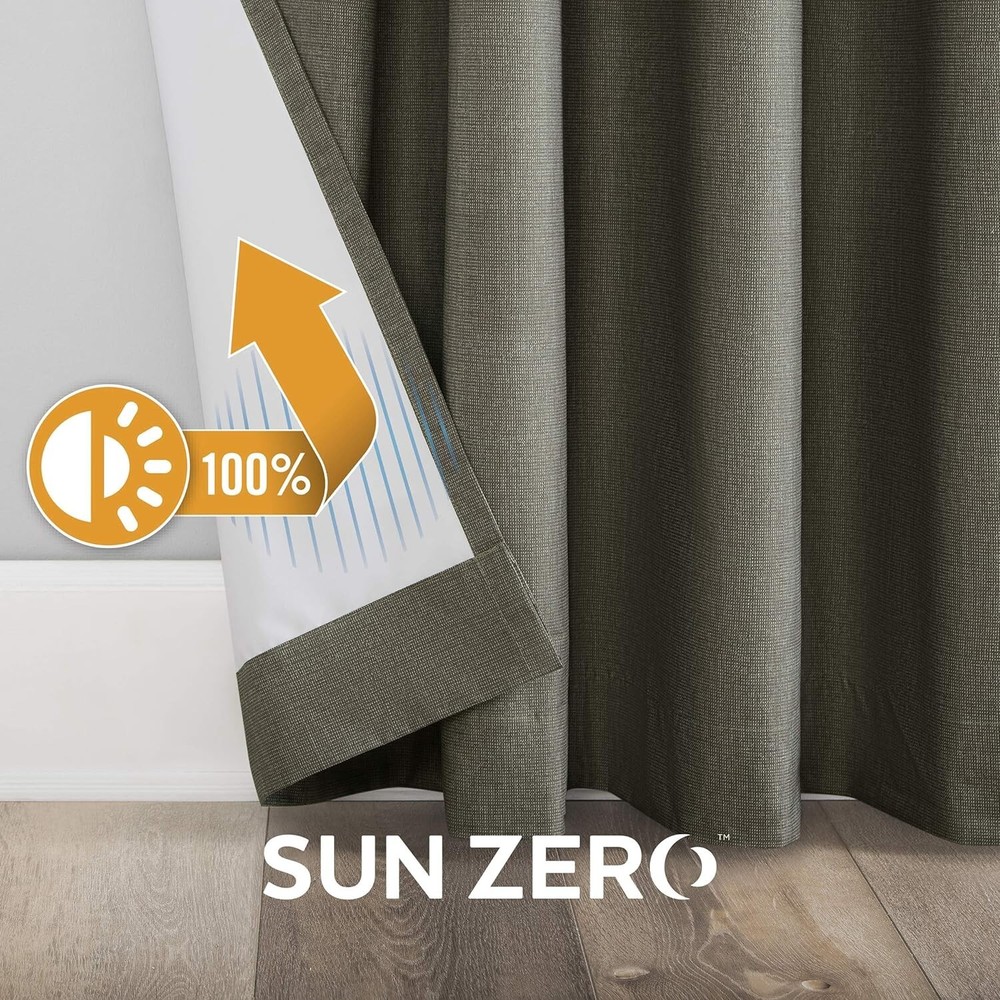 Sun Zero Columbia Thermal Energy Saving 100% Blackout Grommet Curtain 50" x 108" Sun Zero blackout technology blocks out most unwanted light while enhancing privacy. Thermal properties help keep summer heat and winter chill out of your home. Energy-efficient design reduces energy lost through your windows by up to 40%. Noise reduction. Built-in metal grommets fit curtain rods up to 1.5" in diameter. Color - Olive Size - 50" W x 108" L