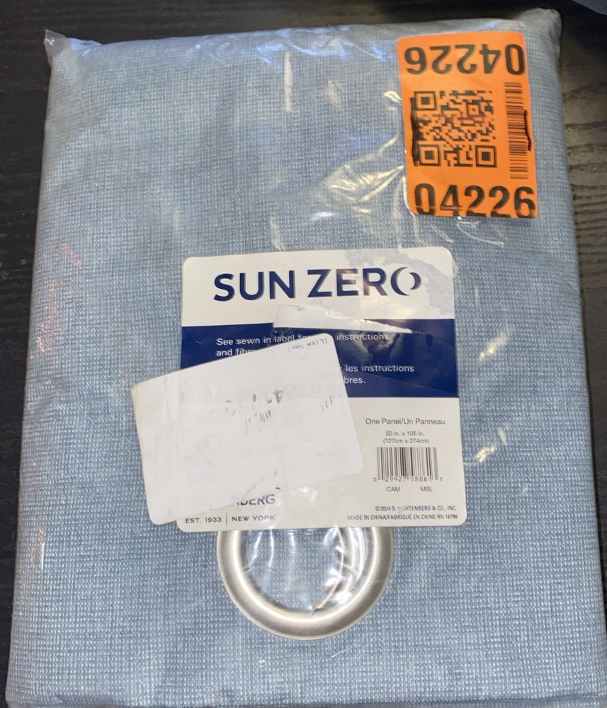 Open package. This is a new, unused item! Top highlights Brand Sun Zero Color Mineral Blue Material Metal Product Dimensions 108"L x 50"W Opacity Blackout Special Feature Noise Reduction 100% Polyester Total Blackout technology blocks out 100% of outside light while enhancing privacy Thermal insulation helps keep summer heat and winter chill out of your home Energy efficient design reduces energy lost through your windows by up to 35% Noise reduction up to 35% helps you get a sounder, more uninterrupted sleep Built-in metal grommets fit curtain rods up to 1.5" in diameter. Includes 1 panel Style Color Mineral Blue Opacity Blackout Room Type. Any Materials & Care Material Type Metal Product Care Instructions Machine Wash Water Resistance Level Not Water Resistant Measurements Item Dimensions L x W 108"L x 50"W Size 50"W x 108"L (Pack of 1) Item Weight 3.97 Pounds Features & Specs Additional Features Noise Reduction Closure Type Grommet Fits Rod Size 1.5 Inches Brand Name Sun Zero Number of Items 2 UPC 029927579567 Manufacturer Sun Zero Customer Reviews 4.2 out of 5 stars 4,619Reviews Best Sellers Rank #142,227 in Home & Kitchen (See Top 100 in Home & Kitchen) #951 in Window Curtain Panels ASIN B089TYQ8LJ Item Height 0.25 inches Style Color Mineral Blue Opacity Blackout Room Type Bedroom Style Name Modern Pattern Solid Theme Space Top Style Grommet, Rod Seasons Summer Materials & Care Material Type Metal Product Care Instructions Machine Wash Water Resistance Level Not Water Resistant Fabric Type 100% Polyester Measurements Item Dimensions L x W 108"L x 50"W Size 50"W x 108"L (Pack of 1) Item Weight 3.97 Pounds Package Weight 1.81 Kilograms Unit Count 2.0 Count Features & Specs Additional Features Noise Reduction Closure Type Grommet Fits Rod Size 1.5 Inches User guide Recommended Uses For Product Indoor Curtain Hanging Method Grommet