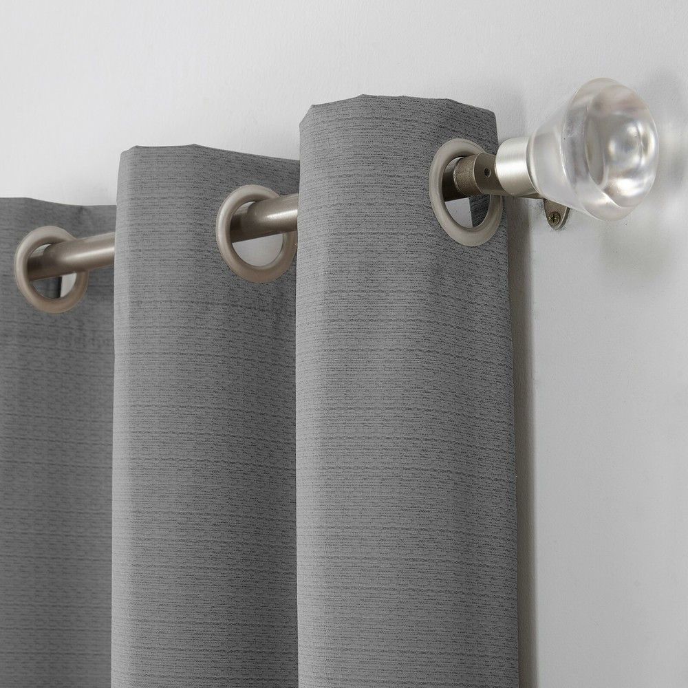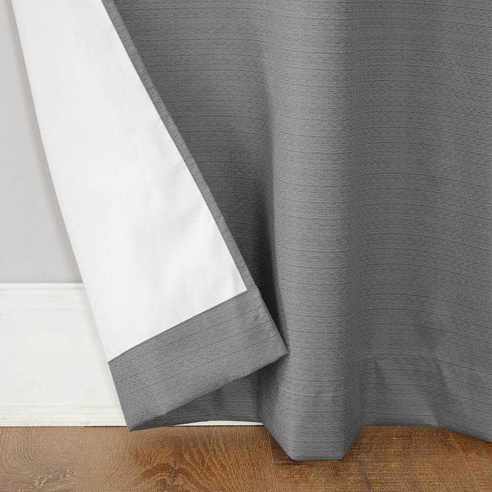 Sun Zero Cooper Textured Thermal-Lined Room Darkening Energy-Efficient Grommet Curtain Panel Sold as a single panel Unique woven textured design with Thermal Insulated Room Darkening technology Energy Efficient design reduces energy lost through your windows by up to 40% Thermal insulation helps you keep the summer heat and winter chill out of your home Noise reduction helps you get a sounder, more uninterrupted sleep Silver metal grommet top fits a standard curtain rod for easy hanging Curtain rod not included. Double rod may be needed for layering. Specifications Number of Pieces: 1 Panel Dimensions (Overall): 95.0 Inches (L), 40 Inches (W) Textile Material: 100% Polyester Includes: 1 Curtain Panel Indoor/Outdoor: Indoor Features: Energy Efficient, Thermal Insulated, noise reduction Backing Material: Polyester Textile construction: Jacquard Hanging style: Grommet Top