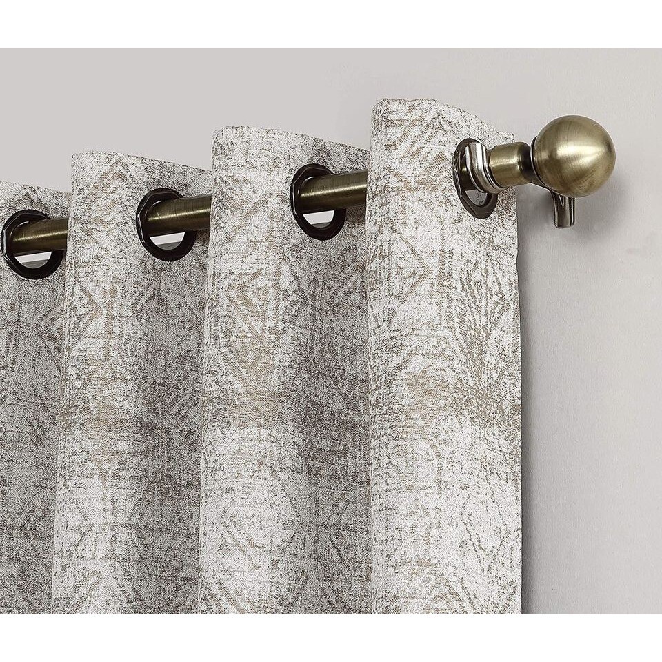 2 panels. Fit a variety of different decor styles - boho, rustic farmhouse, clean white, beach house - you name it. Good condition, may have some small snags on the unseen side of the curtains from rubbing on bamboo blinds. Pet free smoke free home. Polyester Delicately woven distressed global pattern on midweight jacquard fabric Blackout technology blocks out most unwanted light while enhancing privacy Thermal properties help keep summer heat and winter chill out of your home Noise reduction up to 40% helps you get a sounder, more uninterrupted sleep Decorative octagonal gunmetal grommets fit curtain rods up to 1.5"
