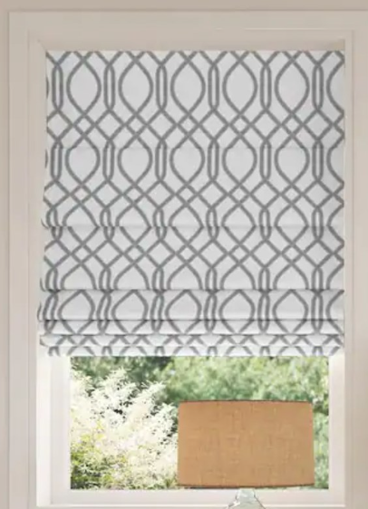 This Sun Zero Roman shade features a modern trellis design in white fabric, offering 100% blackout for any room. The cordless shade is 31x64 inches in size and mounts on the window frame. It has a sleek and contemporary style, ideal for adults looking to add a stylish touch to their home decor.