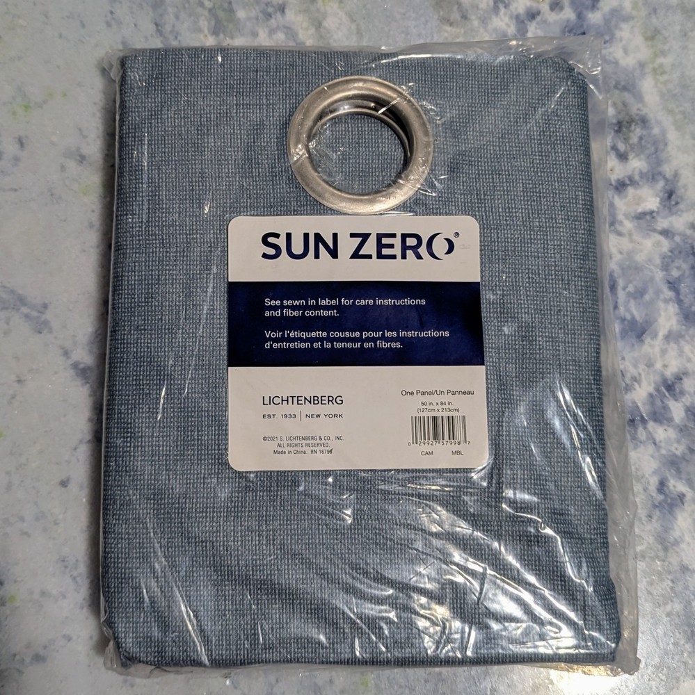 Misty Blue Sun Zero Duran Thermal Insulated 100% Blackout Grommet Curtain Panels provide the ultimate in light blocking technology to keep out even the harshest of light while bringing a subtle texture to any room of your home. Sun Zero Total Blackout technology is laboratory tested to block out 100% of light, reduce outside noise by up to 35%, and decrease energy lost through your windows by up to 35%. Comfort is optimized with thermal insulation that helps keep summer heat and winter chill out of the home. Equipped with built-in metal grommets for easy hanging on standard curtain rods up to 1.5" in diameter. Hang in your entertainment room to eliminate screen glare and reduce distracting outside noise, or in your bedroom for enhanced privacy and a sounder, more uninterrupted sleep.• Total Blackout technology blocks out 100% of outside light while enhancing privacy• Thermal insulation helps keep summer heat and winter chill out of the home• Energy efficient design reduces energy lost through your windows by up to 35%• Noise reduction up to 35% helps you get a sounder, more uninterrupted sleep• Built-in metal grommets fit curtain rods up to 1.5" in diameter• 100% Polyester• Machine washable