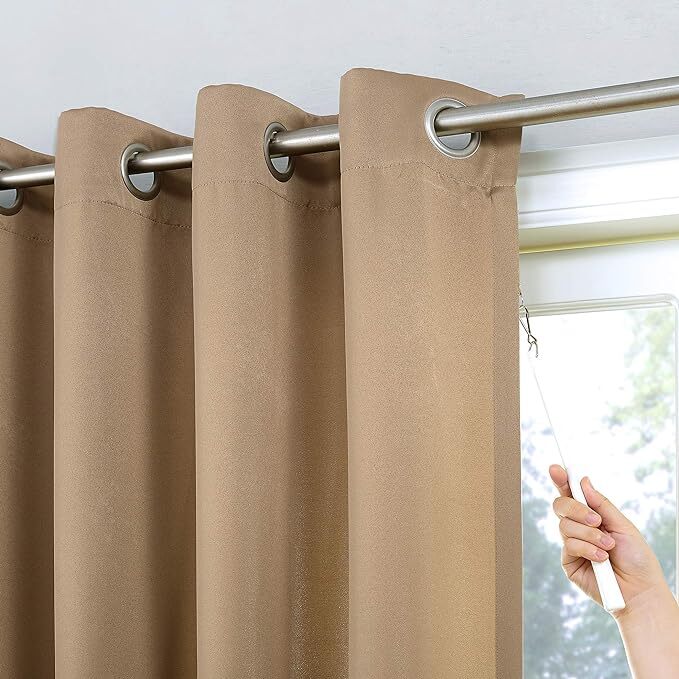 Sun Zero Easton Extra-Wide Blackout Sliding Patio Door Curtain Panel with Pull Wand, 100" x 84", Taupe Product Details Detachable pull wand ideal for sliding glass doors and large windows Blackout technology blocks out most unwanted light while enhancing privacy Energy efficient design reduces energy lost through your windows by up to 40% Thermal properties help keep summer heat and winter chill out of your home; Blocks over 99% of light Noise Reduces outside noise by up to 30%. They will help you get a sounder, better, more uninterrupted sleep. Built-in metal grommets fit curtain rods up to 1.5" in diameter Panels sold individually. Measure carefully prior to purchase. Performance varies by product color; darker the base color the more light blocked Payment Details We stand behind our products. Items can be returned for exchange or full refund within 30 days from the date you receive your merchandise. We are not responsible for any purchase after this 30-day period. Shipping Details Shipping is FREE to all addresses other than APO/PO boxes in the lower 48 states. All our stock ships from our US-based warehouses. Shipped via USPS or UPS (depending on location and package weight) Unless stated otherwise, all orders will ship within 24 hours of your payment being processed. Check our feedback to see the great reviews of FAST shipping we offer. Return Details Domestic lower 48 free shipping is expedited. We have many different shipping locations depending on the product you buy and the shipping location that you choose. We try to ship most items within 24 hours of payment Monday-Friday. Most orders are in transit for two days but some may take longer. If you have a specific time frame please contact us before you make the purchase. Return shipping is the buyer's responsibility unless the return is a result of our mistake. We will pay for shipping replacement back to you if an exchange is requested.