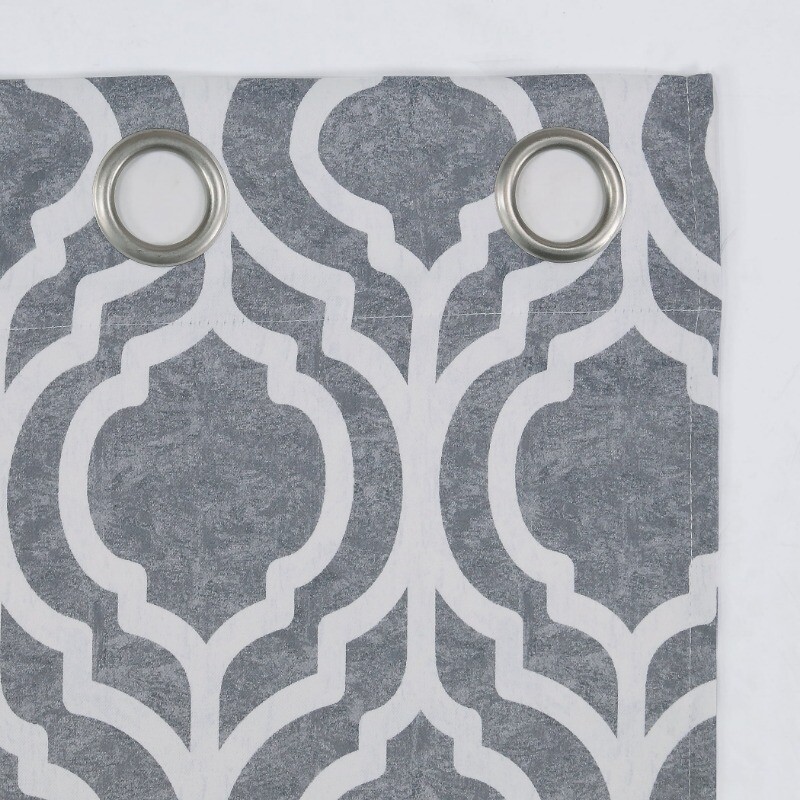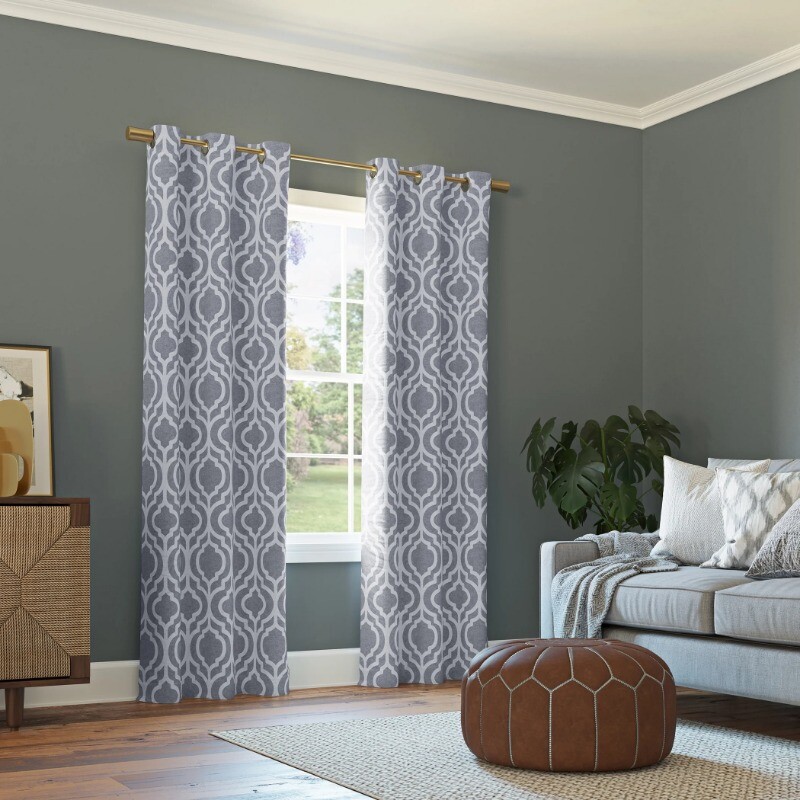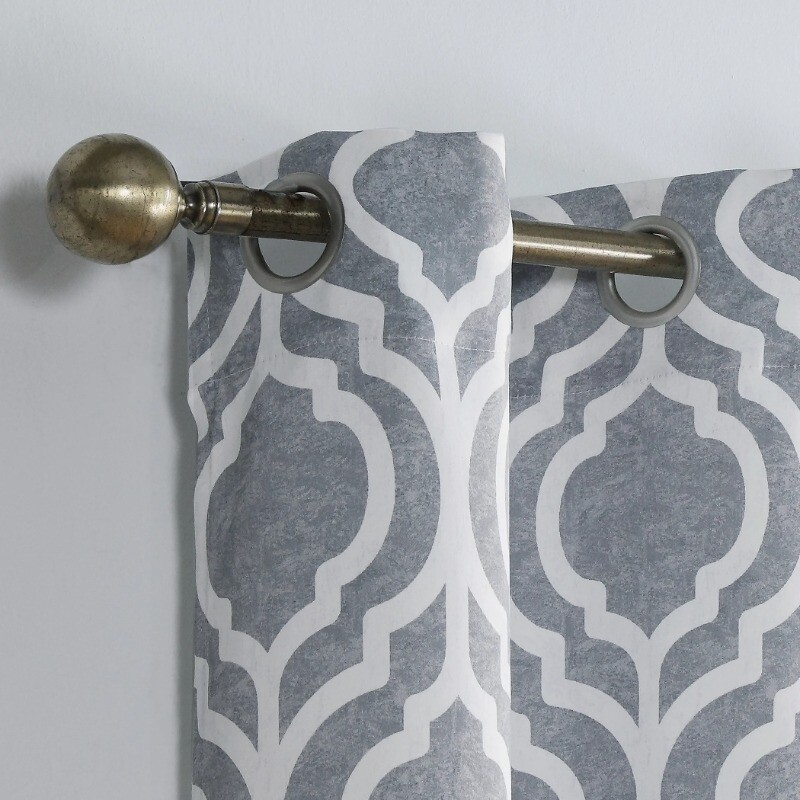 Featuring a geometric trellis print design, Sun Zero Eldon Curtain Panels add global intrigue into any living space. Equipped with built-in metal grommets for easy hanging on standard curtain rods up to 1.5" in diameter. Sun Zero Blackout technology blocks out most outside light, offers outside noise reduction by up to 30%, and decreases energy lost through your windows by up to 40%. Comfort is optimized with thermal properties that help keep summer heat and winter chill out of your home. Hang in your living room for enhanced privacy, or in your bedroom for a sounder, more uninterrupted sleep. Sold as individual panels measuring 40" width by 84" length. Measure carefully before selecting your desired size and quantity. Geometric trellis print design Blackout technology blocks out most unwanted light while enhancing privacy Energy Efficient design reduces energy lost through your windows by up to 25 percent Thermal properties help keep summer heat and winter chill out of your home Noise reduction up to 25 percent helps you get a sounder, more uninterrupted sleep Built-in metal grommets fit curtain rods up to 1.5" in diameter Curtain rod not included. Double rod may be needed for layering.