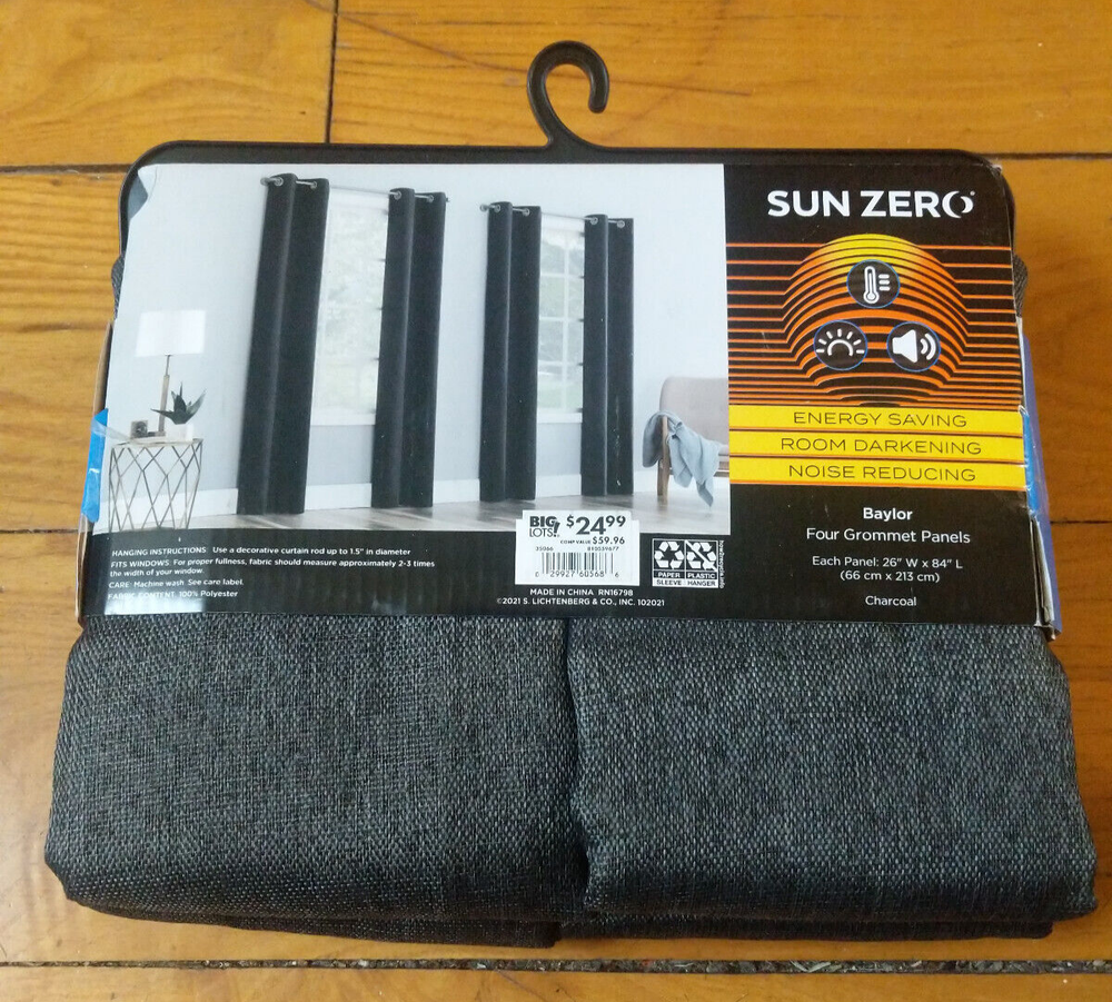 Sun Zero Energy Saving Baylor Curtains consist of 4 gray polyester panels, each measuring 26 inches in width and 84 inches in length. These noise-reducing curtains are designed to darken rooms and save energy, making them ideal for two windows in a home setting.