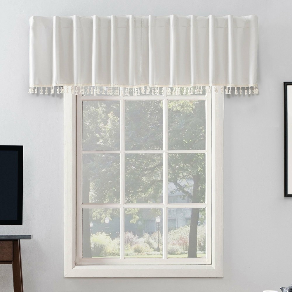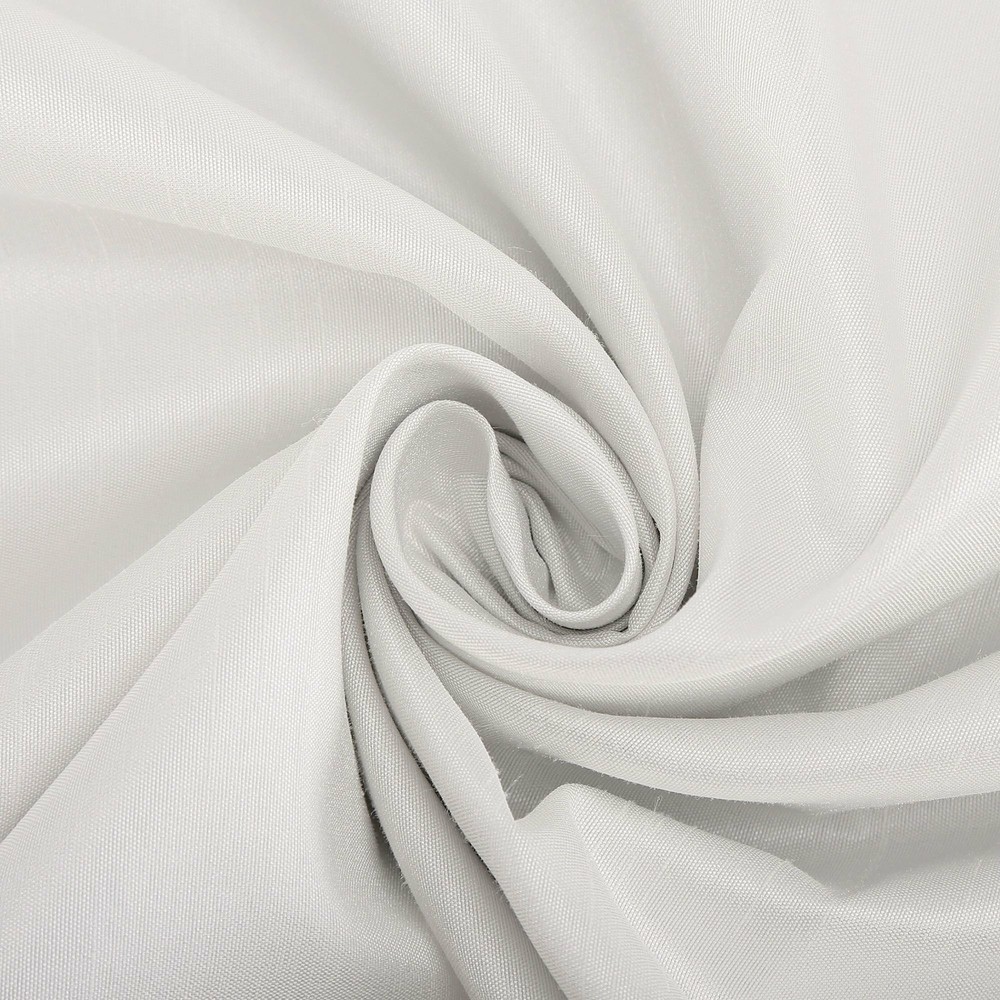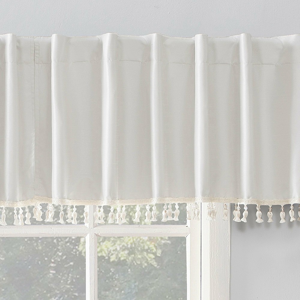 The Evelina Window Valance from Sun Zero makes for a stylish, modern accent in any room. Beautifully designed in a solid tone and woven texture, this window accessory features a thermal insulation layer for added privacy and noise reduction. Modern, solid design features elegant dupioni faux silk sheen with raw slub texture Thermal insulation layer increases privacy and helps reduce outside noise 100% blackout 100% polyester Machine wash Panel hangs on a rod pocket or back tabs Measures 50" W x 17" L Fits a rod up to 1.5" diameter