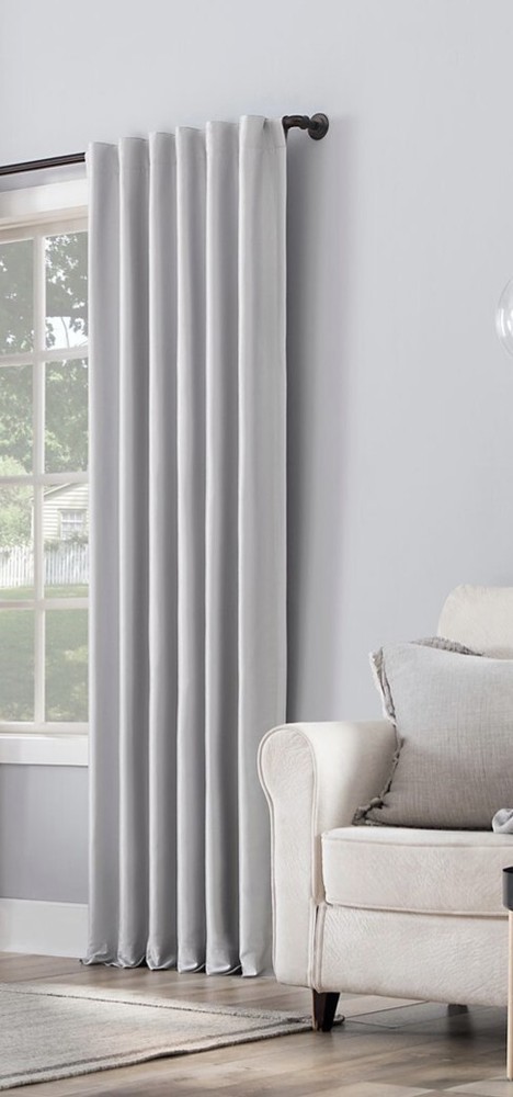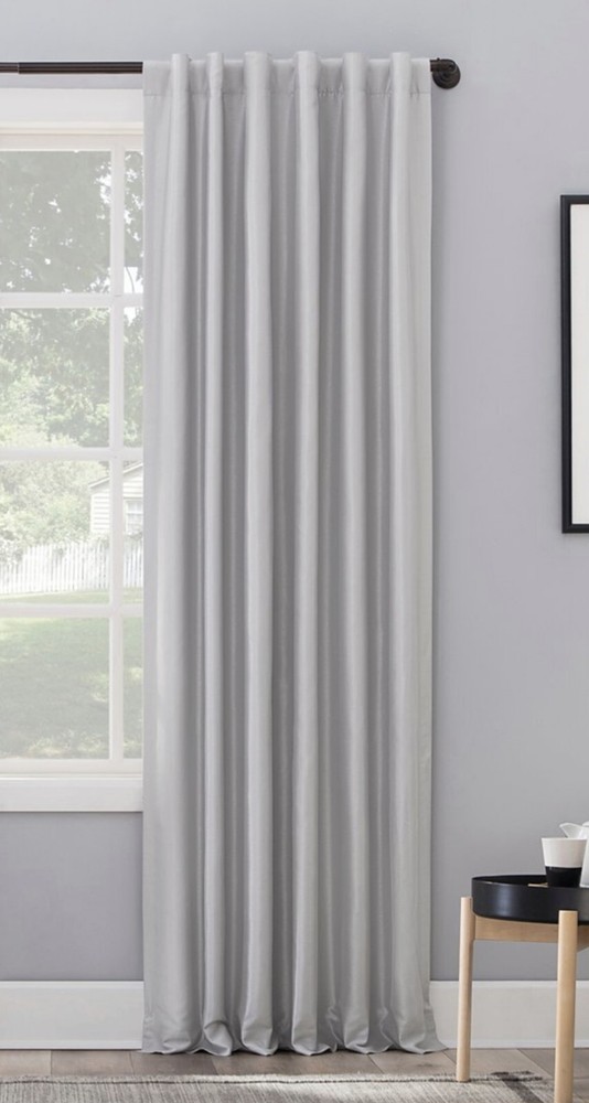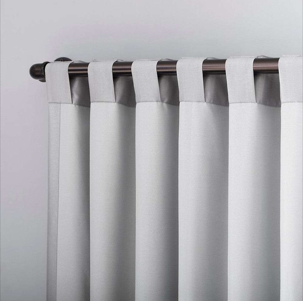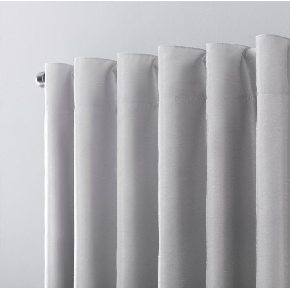 Sun Zero Evelina Faux Evelini Faux Silk Thermal Extreme 100% Blackout Back Tab. Featuring an elegant dupioni faux silk fabric with a raw slub texture, Evelina Faux Dupioni Silk Extreme 100% Blackout Back Tab Curtains provide the ultimate in light blocking technology to keep out even the harshest of light. Elegant faux dupioni silk fabric with a raw slub texture imparts opulent radiance Extreme Blackout Thermal Lining blocks out 100% of outside light Energy Efficient design reduces energy lost through your windows by up to 40% Thermal properties help keep summer heat and winter chill out of your home Noise reduction by up to 30% helps you get a sounder, more uninterrupted sleep Machine wash and dry Back Tab top treatment Panel sold individually and measures 50" W Fits a rod up to 1.5" in diameter