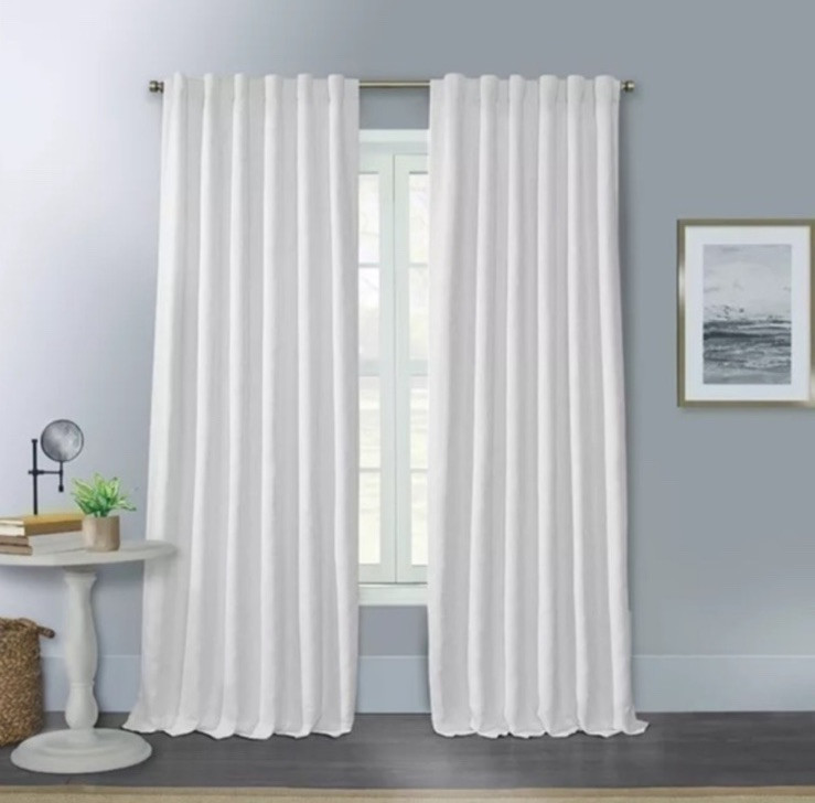 Condition: Open pack, unused. Sun Zero Evelina Faux Evelini Faux Silk Thermal Extreme 100% Blackout Back Tab. 1 panel. Condition: New, open box. Color: White pearl. Transparency: Blackout. Back tab. Size: 50"x108" Ty!