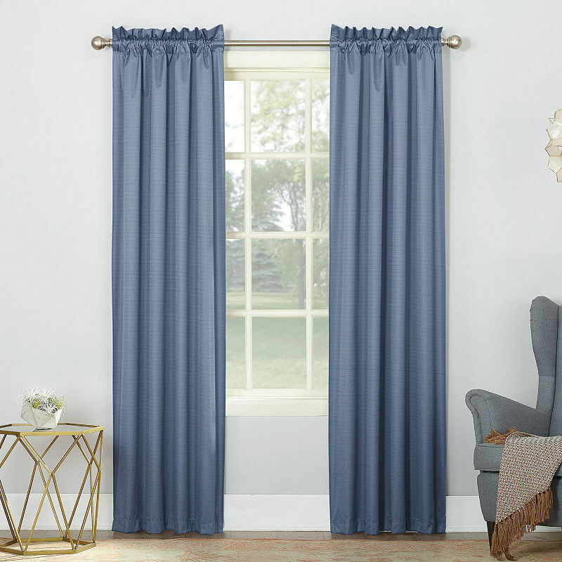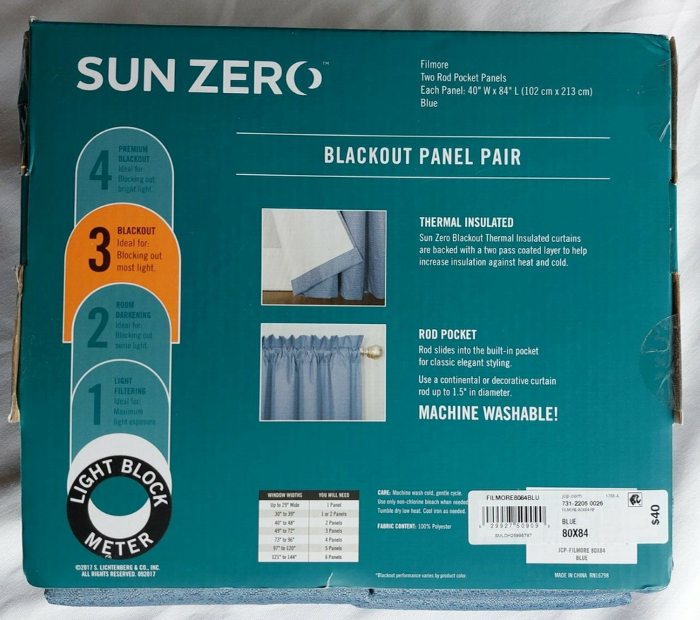 Sun Zero Filmore Blue Thermal Rod-Pocket 2 Curtain Panels. Thermal curtains help keep the cold out and the heat in. Machine washable. Material: 100% Polyester Dimensions: 80" in. W x 84" in. L Two Panels: Each Panel Measures 40" in. W x 84" in. L