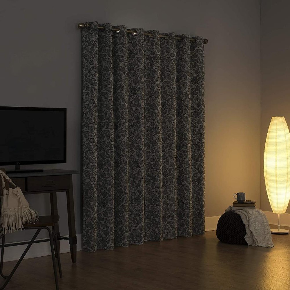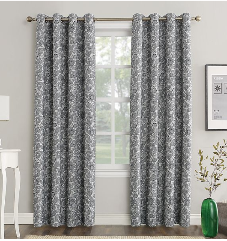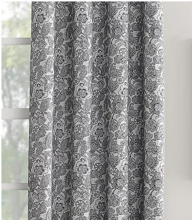 Sun Zero Gray Black Floral Paisley Theater Grade 100% Blackout Curtain 52 x 63 - One Panel Sun Zero Lichtenberg Dagmar Gray & Black 1 Panel Lined 52 x 63 inches Bronze Grommets Theatre Grade 100% Black out Black Paisley Botanical Floral Energy Efficient Blocks out 100% Sunlight Reduces outside noise by 35% 81% Polyester 13% Cotton 6% Rayon Lining is 100% Polyester Nice Textured Fabric! Care: Washable New in Package