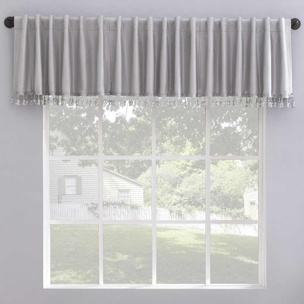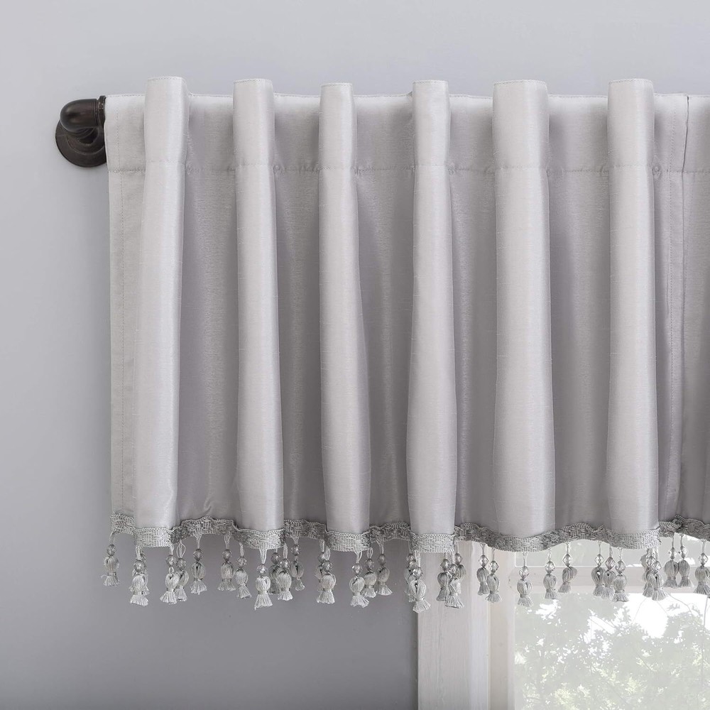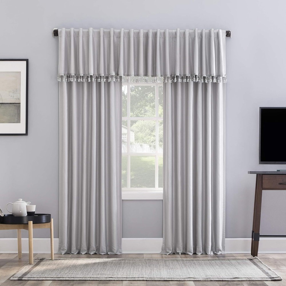 Sun Zero Greyson Faux Dupioni Silk 17"W x 50"L (Pack of 1), Chrome Gray Product Details Brand: Sun Zero Color: Chrome Gray Material: Silk, Faux Silk Product Dimensions: 50"L x 17"W Opacity: Blackout Special Feature: Thermal Insulated Style: Valance Pattern: Solid Theme: Art Curtain Form: Valance Top Style: Back Tab, Rod Size: 17"W x 50"L (Pack of 1) Included Components: Valance Recommended Uses For Product: Indoor Specific Uses For Product: Indoor Weave Type: Plain Seasons: All Season Number of Items: 1 Product Care Instructions: Machine Wash Lining Description: Fabric Package Weight: 0.28 Kilograms Fabric Type: Dupioni,dupioni Silk,faux,faux Dupioni Silk,faux Silk Unit Count: 1.0 Count Compatible with Rod Size: 1.5 Inches UPC: 029927586503 Manufacturer: Sun Zero Item Weight: 9.7 ounces Country of Origin: China Item model number: 58650 Antibacterial treatment: Thermal Batteries required: No Dupioni,dupioni Silk,faux,faux Dupioni Silk,faux Silk Elegant faux dupioni silk valance with a raw slub texture imparts opulent radiance Tassels with ornate beaded detail add a touch of glamor Blocks out 100% of outside light where window is covered Coodinate with the matching curtains (sold separately) on a double rod, or use as a standalone valance Back tabs fit curtain rods up to 1.5" in diameter Valances sold individually (image features 2) Featuring an elegant dupioni faux silk fabric with a raw slub texture, Greyson Faux Dupioni Silk Valances add a touch of glamour with ornately beaded tassels while providing the ultimate in light blocking technology to keep out even the harshest of light. Sun Zero Extreme Blackout Thermal Lining is laboratory tested to block out 100% of light where window is covered. Back tabs fit curtain rods up to 1.5" in diameter for easy slide-through installation. Hang with the matching Sun Zero Greyson Curtains on a double rod, or use as a standalone valance. Sold as individual valances measuring 50" width by 17" length in color chrome gray. Coordinating curtain panels are sold separately. Measure carefully before selecting your desired size and quantity. Rod not included. Machine wash cold on gentle cycle. Use non-chlorine bleach when needed. Tumble dry on low heat, using a cool iron as needed.