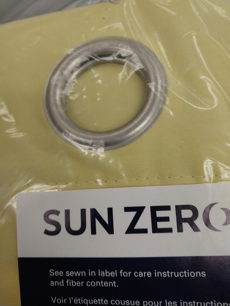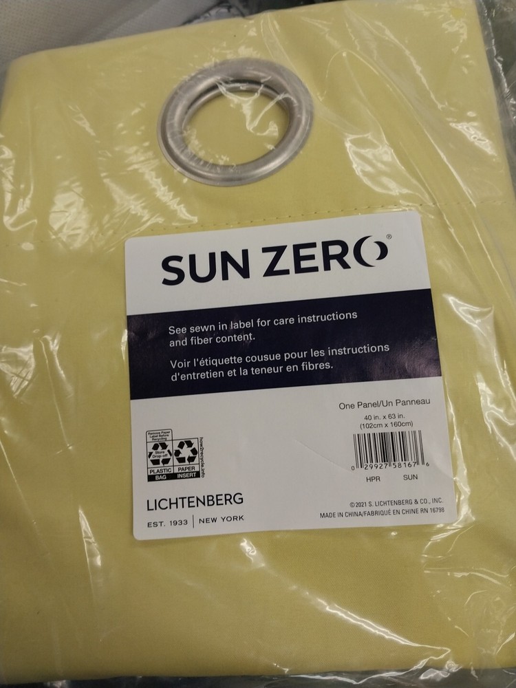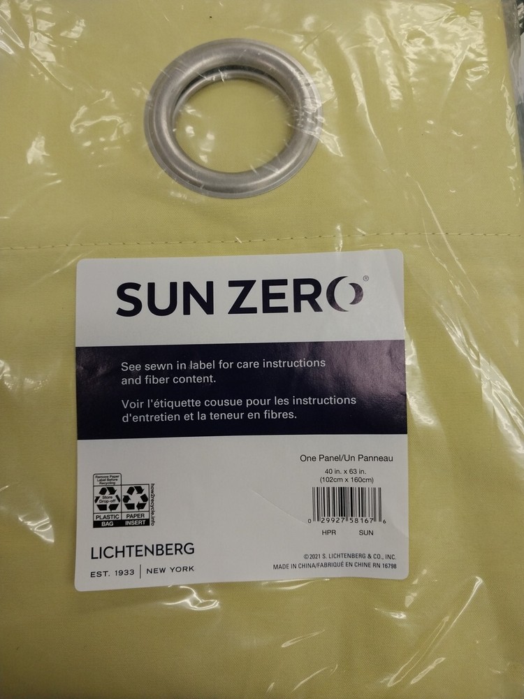 Sun Zero Harper Curtain Panel in sunflower yellows add a bright fun pop of color to a kids bedroom playroom or any room of your home. Sun Zero Total Blackout technology is laboratory tested to block out 100% of light reduce outside noise by up to 35% and decrease energy lost through your windows by up to 35%. Comfort is optimized with thermal insulation that helps keep summer heat and winter chill out of your home. Equipped with built-in metal grommets for easy hanging on standard curtain rods up to 1.5 in diameter. Hang in your entertainment room to eliminate screen glare and reduce distracting outside noise or in your bedroom for enhanced privacy and a sounder more uninterrupted sleep. Sold as individual panels measuring 40 width by 63 length. Measure carefully before selecting your desired size and quantity. Machine wash cold on gentle cycle. Use non-chlorine bleach when needed. Tumble dry on low heat using a cool iron as needed.