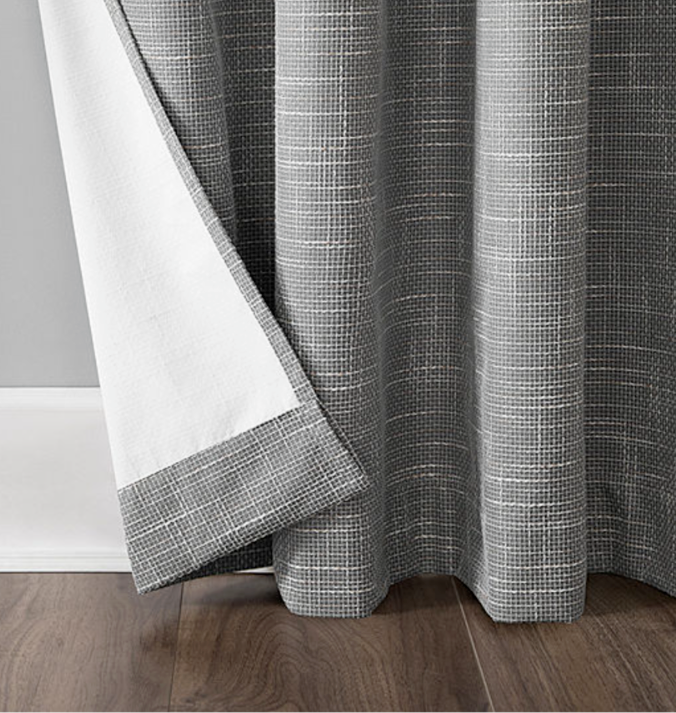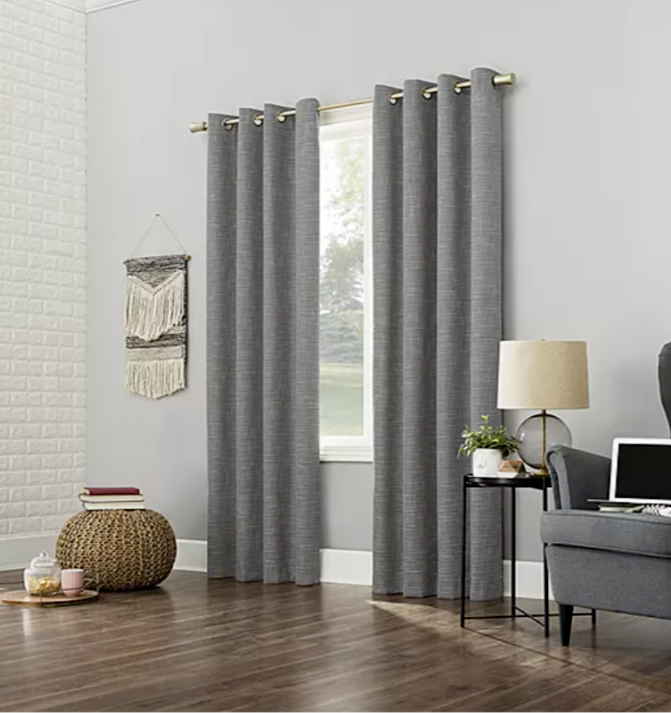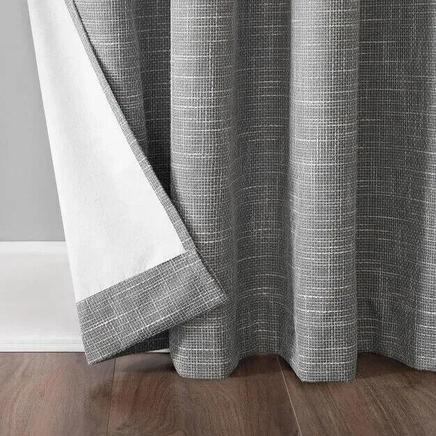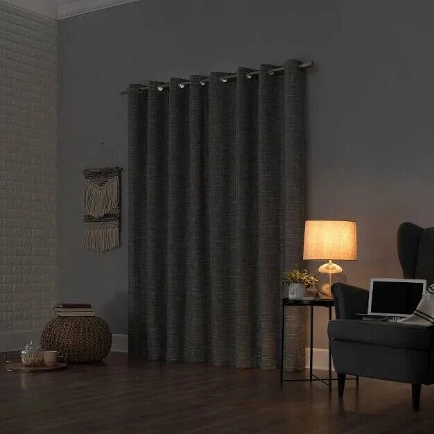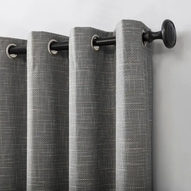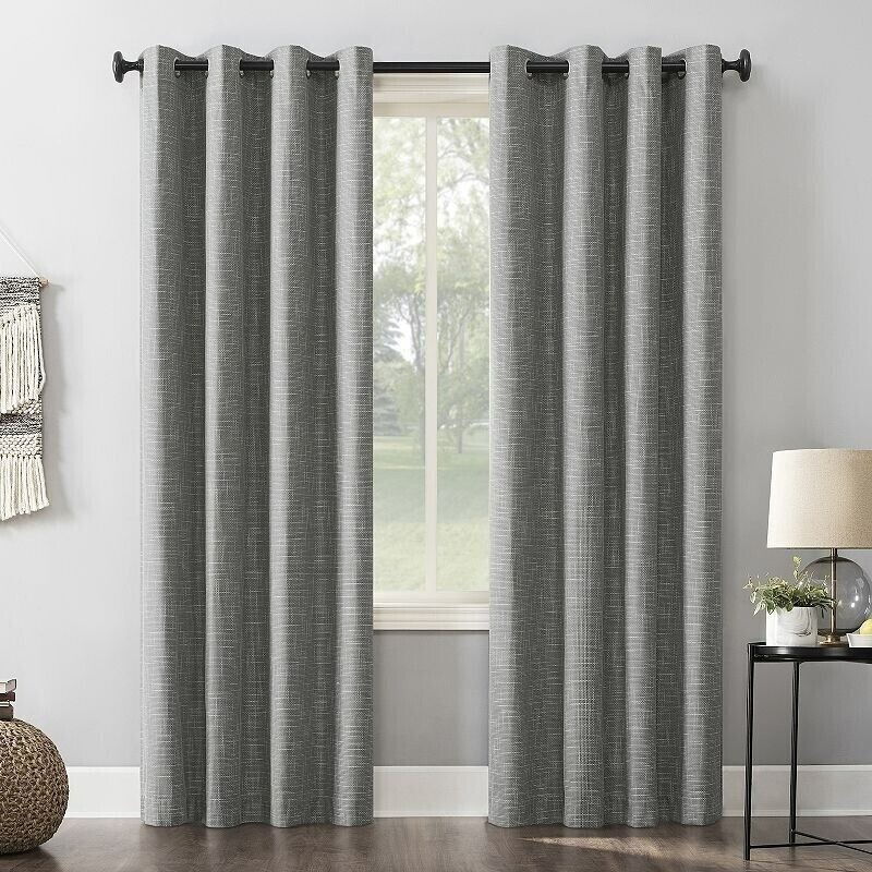 Sun Zero Kline Burlap Weave Thermal Extreme Total Blackout Grommet Curtain Panel, Single Panel - 52 x 84 - Gray Brand: Sun Zero Featuring an intersecting burlap weave texture, Sun Zero Kline Burlap Weave Thermal Extreme 100% Blackout Grommet Curtain Panels add a hint of rustic chic to any living space. Equipped with built in. metal grommets for easy hanging on standard curtain rods up to 1.5 in. in Dia. Sun Zero Extreme Blackout Thermal Lining is laboratory tested to block out 100% of light, reduce outside noise by up to 40%, and decrease energy lost through your windows by up to 40%. Comfort is optimized with thermal properties that help keep summer heat and winter chill out of your home. Built in. metal grommets allow for easy slide-through installation on curtain rods up to 1.5 in. in Dia. Hang in your entertainment room to eliminate screen glare and reduce distracting outside noise, or in your bedroom for enhanced privacy and a sounder, more uninterrupted sleep. Color: Gray. Size: 52x84US T2 3B