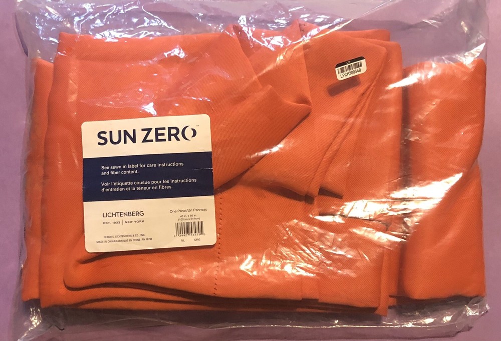 Sun Zero Lichtenberg 1 Grommet Curtain Panel Orange 40 Inch x 95 inch. Like new condition in open package. Free shipping. Block out unwanted light with a bright, fun pop of color in a kids bedroom, playroom, or any room of your home Energy efficient design reduces energy lost through your windows by up to 40% Thermal properties help keep summer heat and winter chill out of the room Noise reduction up to 30% for a sounder, more uninterrupted sleep Silver metal grommets allow for easy hanging on a curtain rod up to 1. 5"