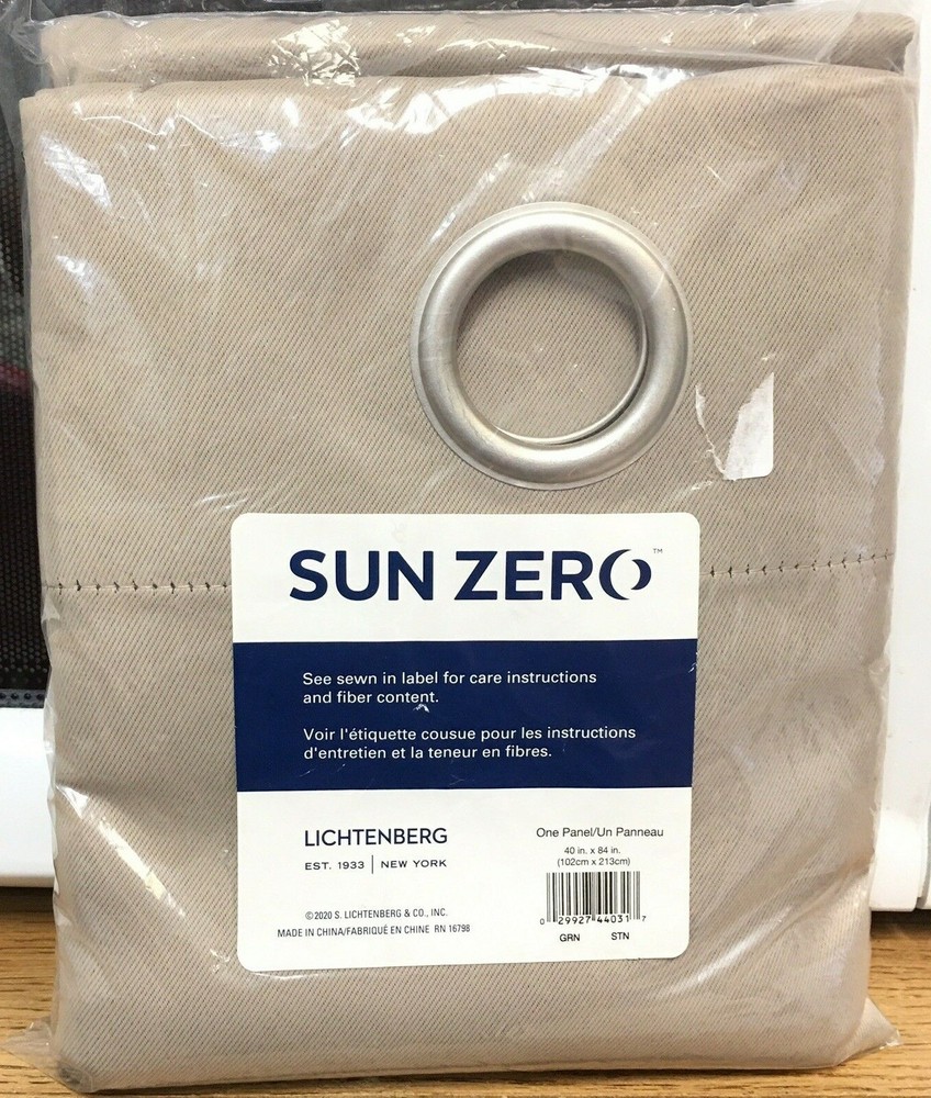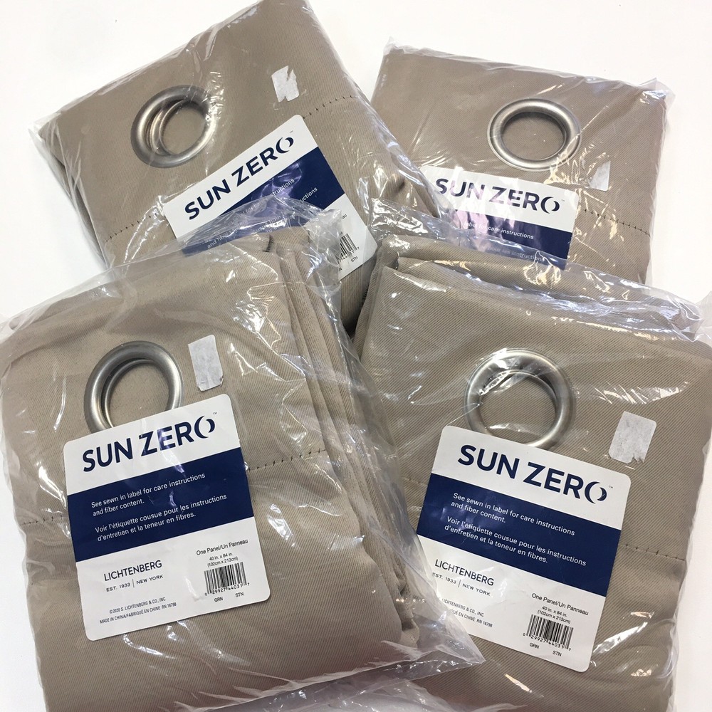 Sun Zero Lichtenberg Grommet Darkening Curtains 4 Panel Set Lot Size: 40"x84" Color: Stone (Beige) New in Packages Sun Zero Blackout Panel is perfect for any room in your home. The woven solid design with an easy to hang grommet-top offers a classic style that fits in with any room décor while blocking light and noise for better sleep. help keep your home cooler in the summer and warmer in the winter. Blackout or opaque panels virtually block all light; a lamp has to be turned on to see inside a room when closed. This panel gives complete privacy. Energy efficient Light blocking / Noise reducing Privacy enhancing Machine washable 100% polyester My Home is Pet & Smoke Free! 1F Tote 2 0821-132