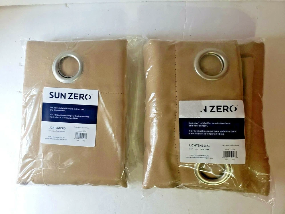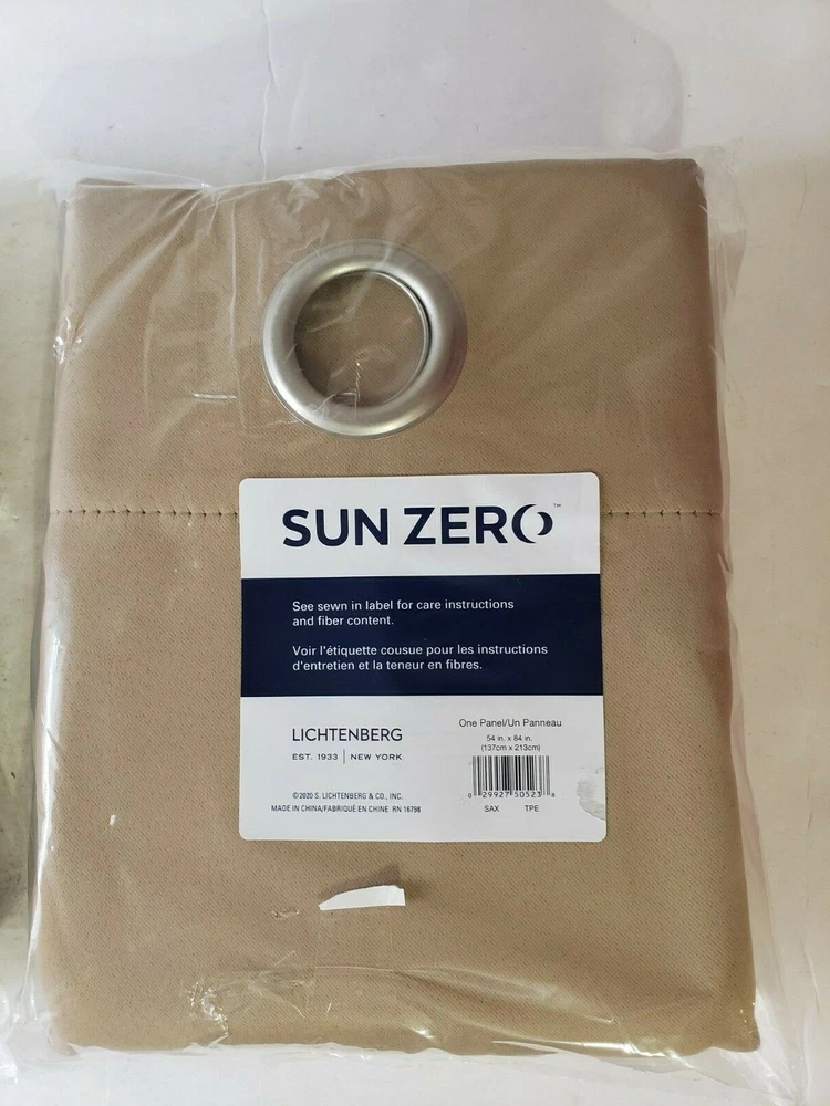 WE DO NOT SHIP TO P.O. BOXES. PLEASE PROVIDE A PHYSICAL MAILING ADDRESS. SET OF 2 PANELS. ONE PANEL PACKAGE HAS BEEN OPENED; HOWEVER, ITEMS ARE UNUSED. Item will be shipped free by USPS Priority Mail/UPS within 48 Lower States (NO SHIPPING for Alaska, Hawaii or Puerto Rico) THIS IS A SET OF 2 PANELS - EACH PACKAGE CONTAINS 1 PANEL Sun Zero Kenneth Curtain Panels infuse a modern sophistication into any living space. Equipped with built-in metal grommets for easy hanging on standard curtain rods up to 1.5" in diameter. Sun Zero Blackout technology blocks out most outside light offers outside noise reduction by up to 25%, and decreases energy lost through your windows by up to 25%. Comfort is optimized with thermal properties that help keep summer heat and winter chill out of your home. Hang in your living room for enhanced privacy, or in your bedroom for a sounder, more uninterrupted sleep. Rod not included. Machine wash cold on gentle cycle. Use non-chlorine bleach when needed. Tumble dry on low heat, using a cool iron as needed Blackout technology blocks out most unwanted light while enhancing privacy Energy efficient design reduces energy lost through your windows by up to 25% Thermal properties help keep summer heat and winter chill out of your home Noise reduction up to 25% helps you get a sounder, more uninterrupted sleep Built-in metal grommets fit curtain rods up to 1.5" in diameter