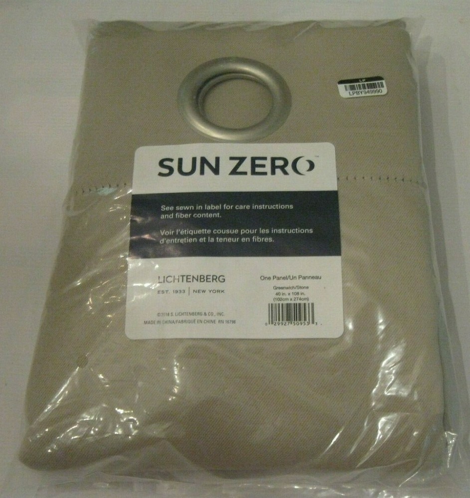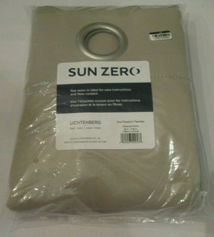 one panel / new Sun Zero Nolan Curtain Panel in stone is perfect for any room in your home. The woven solid design with an easy to hang grommet-top offers a classic style that fits in with any room decor while blocking light and noise for better sleep; help keep your home cooler in the summer and warmer in the winter. Blackout or opaque panels virtually block all light. The valance when paired with panels does not allow any light to come through; a lamp has to be turned on to see inside a room when closed. This panel gives complete privacy. Sold individually. Hang on a rod up to 1.5 inch in diameter. Polyester. Washable. Imported. Sold as individual panels measuring 40" width by 108" length. Measure carefully before selecting your desired size and quantity. Machine wash cold on gentle cycle. Use non-chlorine bleach when needed. Tumble dry on low heat, using a cool iron as needed. Attributes: Weight: 25.6 lbs Size: 40x108
