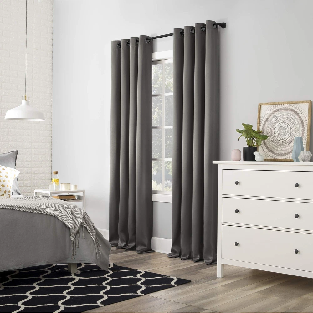 These blackout curtains are amazing! They block out all light, making my room pitch dark even at noon. The gray color looks sleek, and the grommets slide smoothly on the rod. Super thick material—no noise or drafts get through. Super easy to install, and they arrived fast with free shipping. Perfect for movie nights or sleeping in! Highly recommend for anyone needing total darkness.