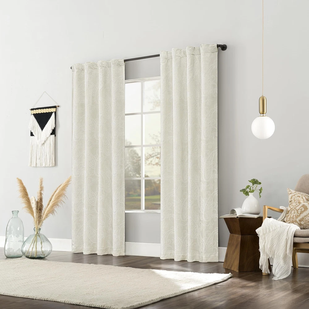 Sun Zero Pedra Paisley Embroidery Blackout Back Tab Curtain Panel,Pearl White Featuring an intricately embroidered paisley pattern, Sun Zero Pedra Paisley Embroidery 100% Blackout Back Tab Curtain Panels add delicate detail to any living space. Equipped with hidden back tabs for easy hanging on standard curtain rods up to 1.5" in diameter. Sun Zero Extreme Blackout Thermal Lining is laboratory tested to block out 100% of light, reduce outside noise by up to 40%, and decrease energy lost through your windows by up to 40%. Comfort is optimized with thermal properties that help keep summer heat and winter chill out of your home. Built-in metal grommets allow for easy slide-through installation on curtain rods up to 1.5" in diameter. Hang in your entertainment room to eliminate screen glare and reduce distracting outside noise, or in your bedroom for enhanced privacy and a sounder, more uninterrupted sleep. Sold as individual panels measuring 40" width by 84" length in color pearl white. Measure carefully before selecting your desired size and quantity. Rod not included. Machine wash cold on gentle cycle. Use non-chlorine bleach when needed. Tumble dry on low heat, using a cool iron as needed. Features Intricately embroidered paisley pattern adds delicate detail Extreme Thermal Blackout technology blocks out 100% of outside light Thermal properties help keep summer heat and winter chill out of your home Noise reduction up to 40% helps you get a sounder, more uninterrupted sleep Hidden back tabs fit curtain rods up to 1.5" in diameter Panels sold individually. Measure carefully prior to purchase (Image features 2 panels) Details Fast Free Shipping We get your order shipped out within 1-business day and delivered to your doorstep as quickly as possible with free shipping. Competitive Pricing With our dynamic pricing model, our prices are always competitive. Our prices are some of the lowest that you will find on the internet. Rest assured that you're getting a good deal when purchasing with us. 30-day Money Back Guarantee We are committed to making sure that you leave this transaction satisfied. If you're unhappy with the product for any reason, you may return it back for your money-back or a replacement within 30 days. No questions asked!