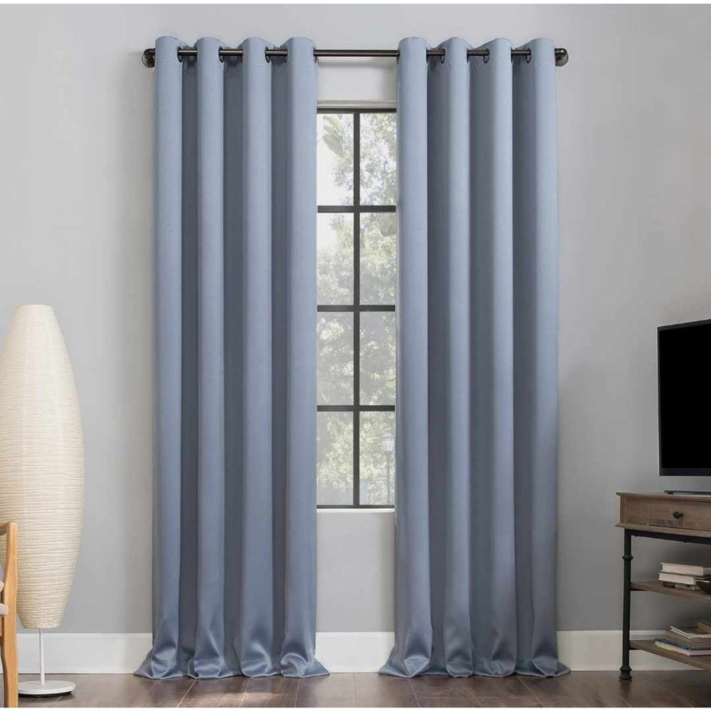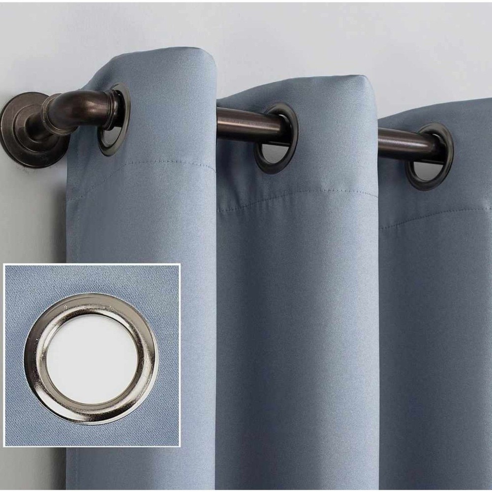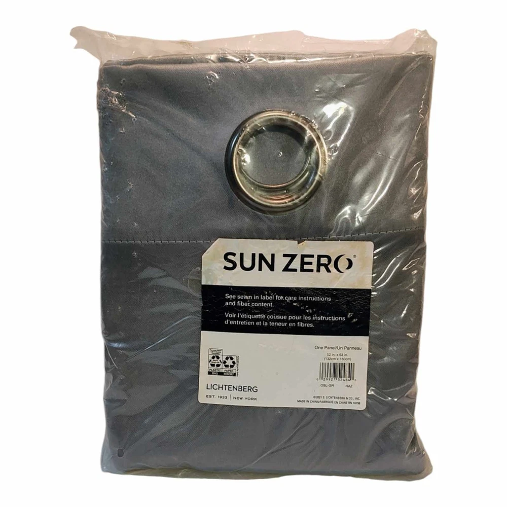 Sun Zero Room Darkening Blackout Curtain Panel Grommet 52x63 Haze Blue New in Package. Package shows some wear due to storage. Extreme Blackout technology blocks out 100% of outside light Energy Efficient design reduces energy lost through your windows by up to 50% Thermal properties help keep summer heat and winter chill out of your home Noise reduction by up to 35% helps you get a sounder, more uninterrupted sleep Includes 1 single grommet curtain panel made from machine washable material Curtain rod not included. Double rod may be needed for layering. Smoke Free Pet Free Home Fast Shipping A701