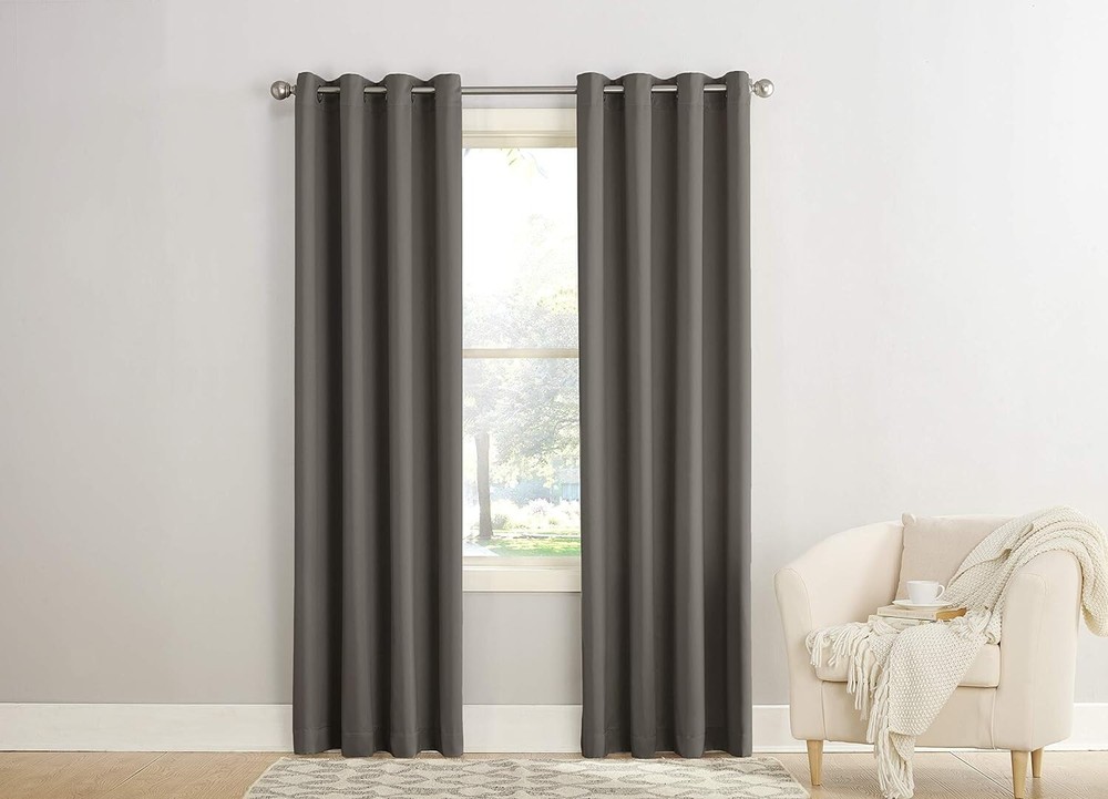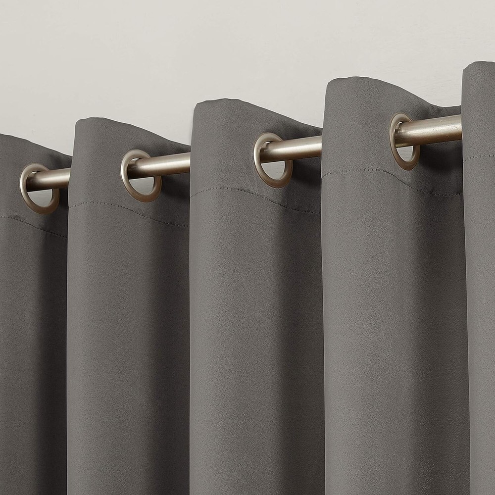 Sun Zero Solid Grommet Room Darkening Single Curtain Panel, 54'' x 108'' Steel New condition in retail packaging. Listing is for ONE CURTAIN PANEL measuring 54'' x 108''. Color is steel gray. Product details Sun Zero Madison Room Darkening panel brings style and energy efficiency to any home. The woven solid design with an easy to hang grommet-top offers a classic style that fits in with any room decor while reducing light and noise for better sleep; help keep your home cooler in the summer and warmer in the winter. Room Darkening panels are made of materials that reduce light, and considerably darken the room. Some light will show through. These materials do not allow a view through and provide complete privacy. The darker the color the better the light reducing capabilities. Sold individually. Hang on a rod up to 1.5" in diameter. Polyester. Washable. Imported. Room Darkening technology blocks out some unwanted light while enhancing privacy Energy efficient design reduces energy lost through your windows by up to 25% Thermal properties help keep summer heat and winter chill out of your home Noise reduction up to 25% helps you get a sounder, more uninterrupted sleep Built-in metal grommets fit curtain rods up to 1.5" in diameter Each panel sold separately Curtain rod not included. Double rod may be needed for layering.