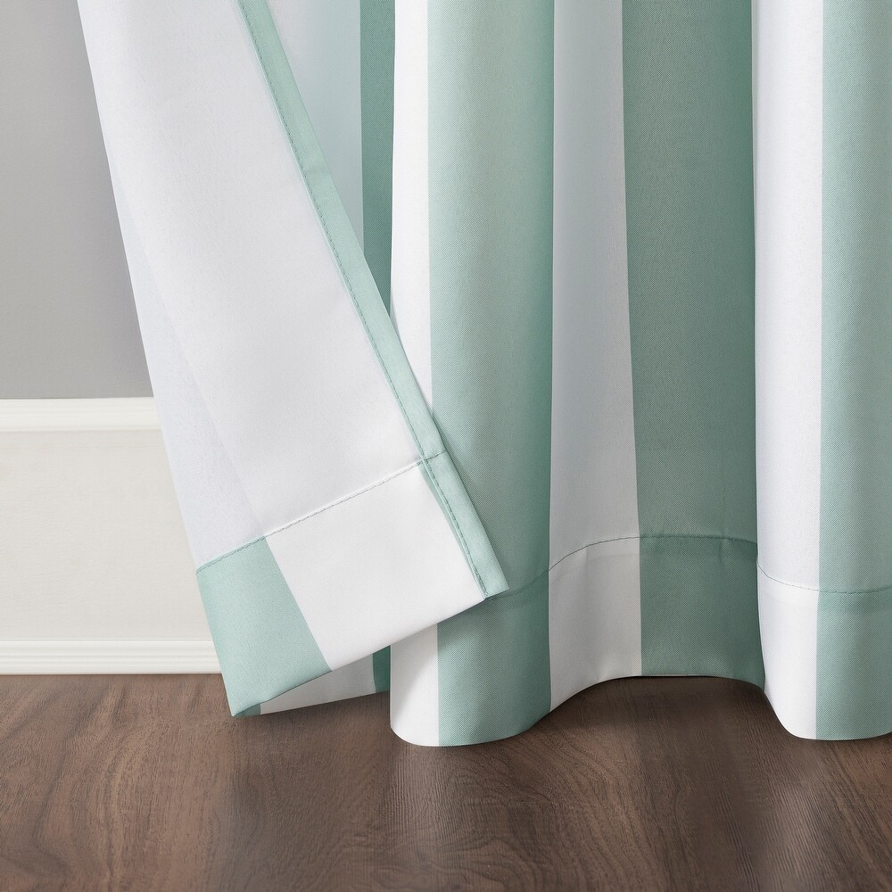This is an open box item. The packaging is slightly damaged due to handling but the item is in new condition. This listing is for ONE panel only. Features: Vertical cabana stripe design adds a coastal ambience Fade resistant durable indoor/outdoor fabric Offers light blocking with UPF 50+ UV Protection Stain and water resistant lightweight material Ideal for outdoor pergolas and gazebos Add a coastal ambience to your outdoor or indoor space with the Sun Zero Valencia Cabana Stripe Indoor/Outdoor UV Protectant. Woven with durable stain-resistant, water-resistant, fade-resistant, and light-blocking lightweight fabric offering upf 50+ UV protection, these curtains are the perfect solution to add privacy and protect your deck, patio, porch, or outdoor space from the elements. Perfect for pergolas and Gazebos, Sun Zero Cabana Stripe Indoor/Outdoor UV Protectant is equipped with rust-proof grommets allowing easy hanging on a standard curtain rod up to 1.5 inch in diameter.