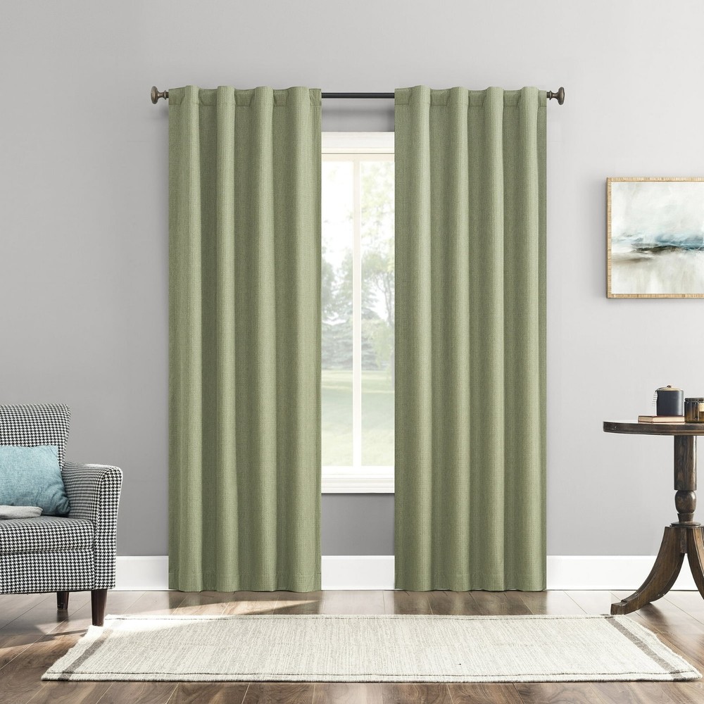 About this item Delicately woven textured design Extreme Thermal Blackout technology blocks out 100 percent of outside light Thermal properties help keep summer heat and winter chill out of your home Noise reduction up to 40 percent helps you get a sounder, more uninterrupted sleep Hidden back tabs fit curtain rods up to 1.5" in diameter Pair includes two (2) panels measuring 37" W each. Measure carefully prior to purchase. Curtain rod not included. Double rod may be needed for layering.