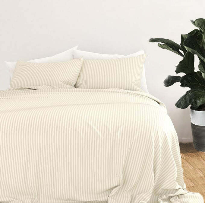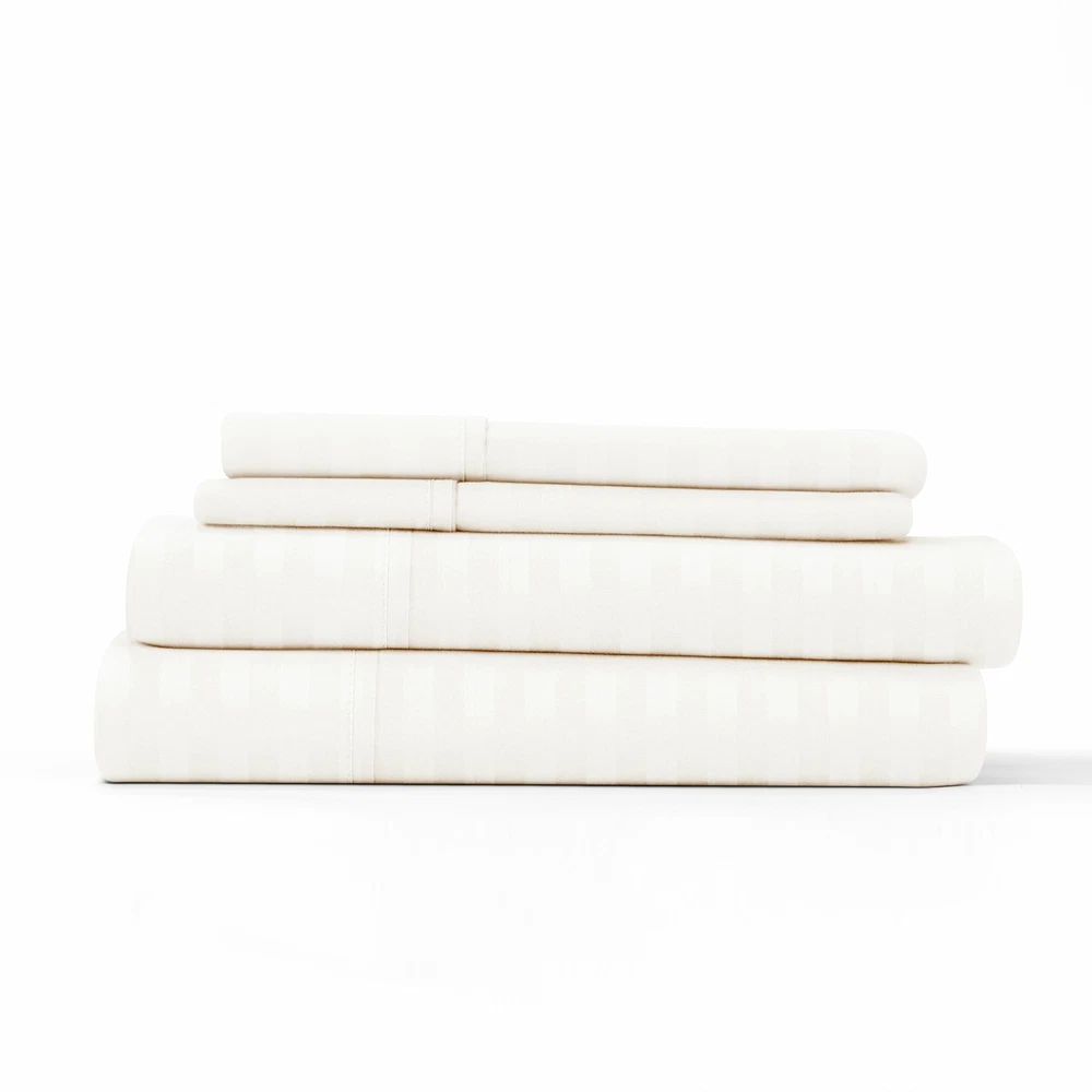 The Ienjoy double-brushed microfiber sheet set is made of ultra-plush, soft 90 GSM microfiber from premium yarns that are super-soft, wrinkle resistant and twice as durable as cotton. Naturally hypoallergenic, they are ideal for those with sensitive skin and allergies. Microfiber also wicks away moisture or humidity so they can be easily used during any season. Multiple patterns and colors are available. Each sheet set includes a fitted and flat sheet. Full and Queen sheet sets include two standard pillow cases while the King sheet set includes two King pillow cases. Care: Machine wash and dry normal. This sheet set is ivory with an embossed stripe pattern. Full 81x96 Inches Queen 90x102 inches King 102x105 inches