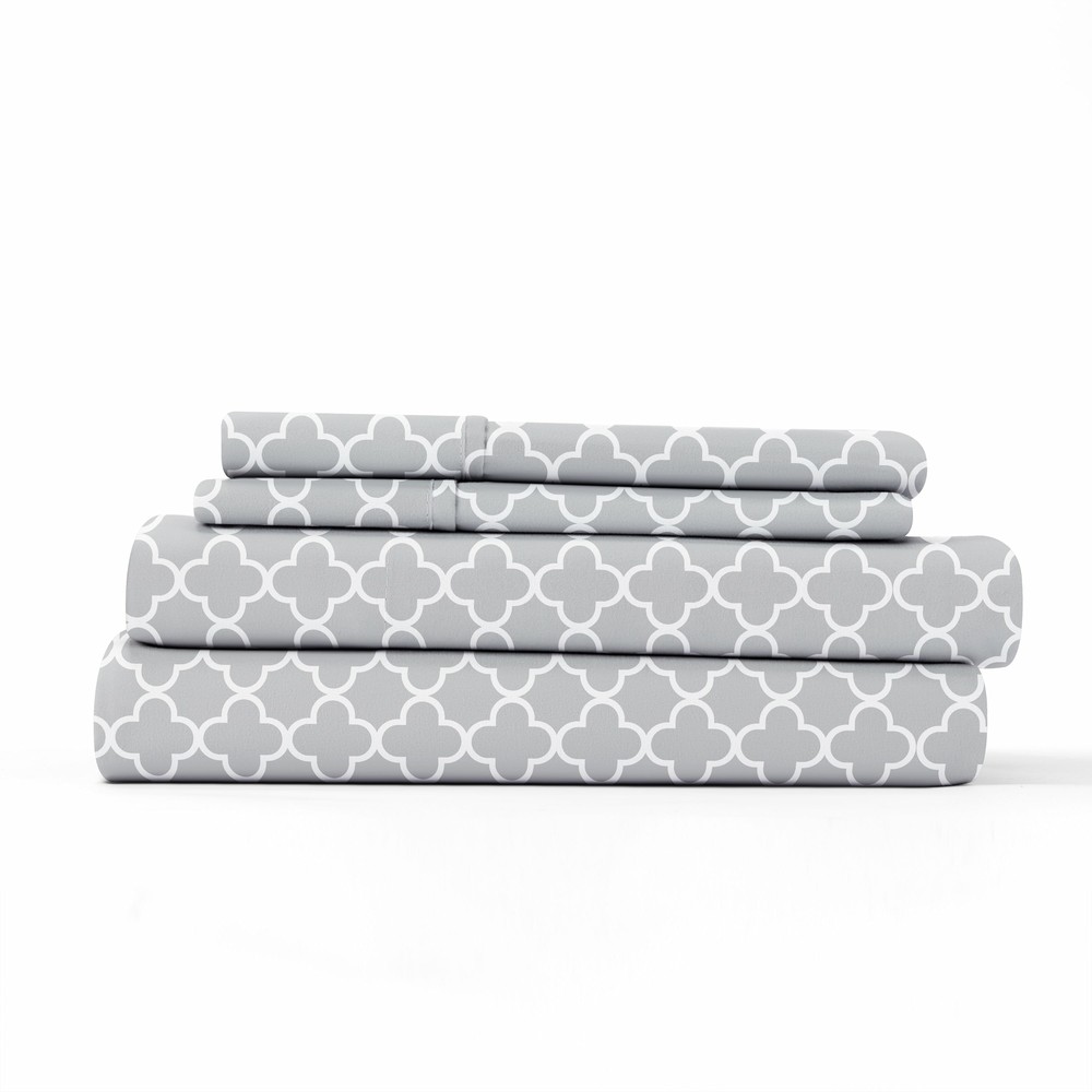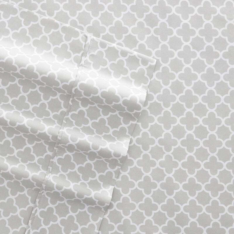 The Ienjoy double-brushed microfiber sheet set is made of ultra-plush, soft 90 GSM microfiber from premium yarns that are super-soft, wrinkle resistant and twice as durable as cotton. Naturally hypoallergenic, they are ideal for those with sensitive skin and allergies. Microfiber also wicks away moisture or humidity so they can be easily used during any season. Multiple patterns and colors are available. Each sheet set includes a fitted and flat sheet. Full and Queen sheet sets include two standard pillow cases while the King sheet set includes two King pillow cases. Care: Machine wash and dry normal. This sheet set is gray with a white quatrefoil pattern. Full 81x96 Inches Queen 90x102 inches King 102x105 inches