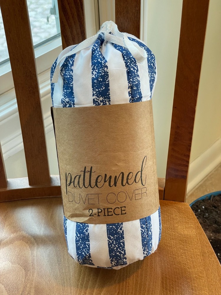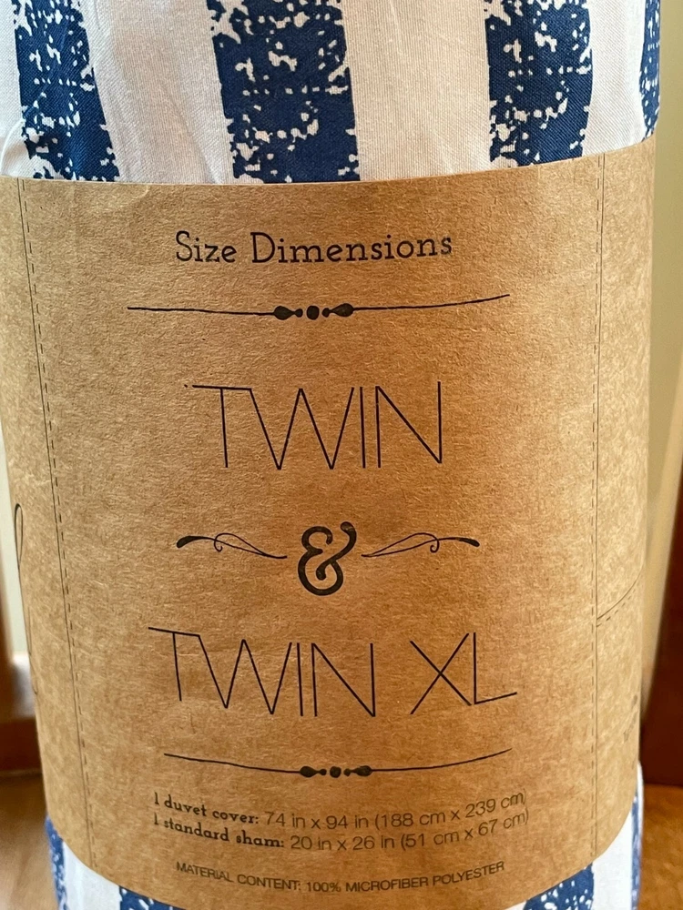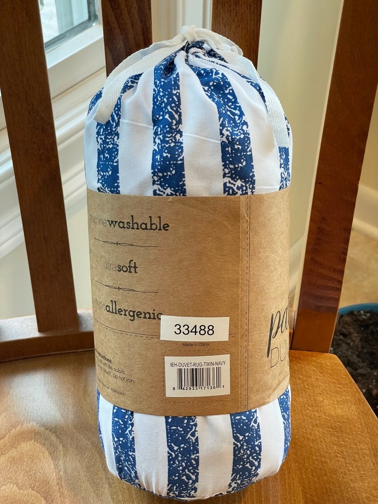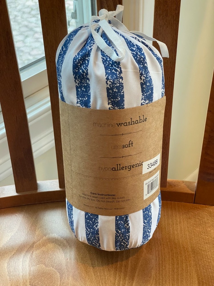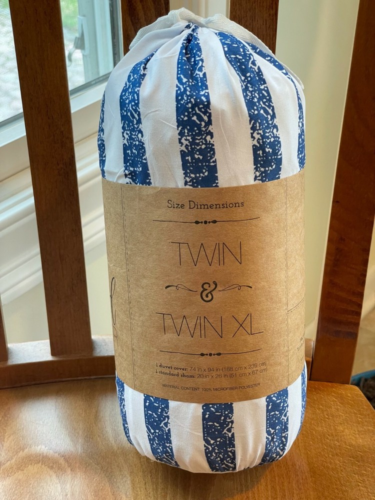 ienjoy home XL blue and white striped pattern duvet cover and sham set. Brand new. Hypoallergenic, ultra soft and machine washable. Great for the dorm. Take a look at the other great items we have for sale. Reach out with any questions.