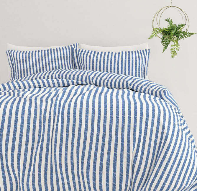 The Ienjoy double-brushed microfiber duvet set is made of ultra-plush, soft 90 GSM microfiber from premium yarns that are super-soft, wrinkle resistant and twice as durable as cotton. Naturally hypoallergenic, they are ideal for those with sensitive skin and allergies. Microfiber also wicks away moisture or humidity so they can be easily used during any season. Multiple patterns and colors are available. Each duvet set includes the duvet cover, one standard sham for twin size and two shams for Full/Queen/King. Full and Queen duvet set include two standard shams while the King duvet set includes two King shams. Care: Machine wash and dry normal. This Duvet Cover is white with a rugged blue stripe pattern on both sides. The cover also features a zippered closure and corner ties. Twin 74x94 Inches Full/Queen 96x96 Inches King 112x98 inches