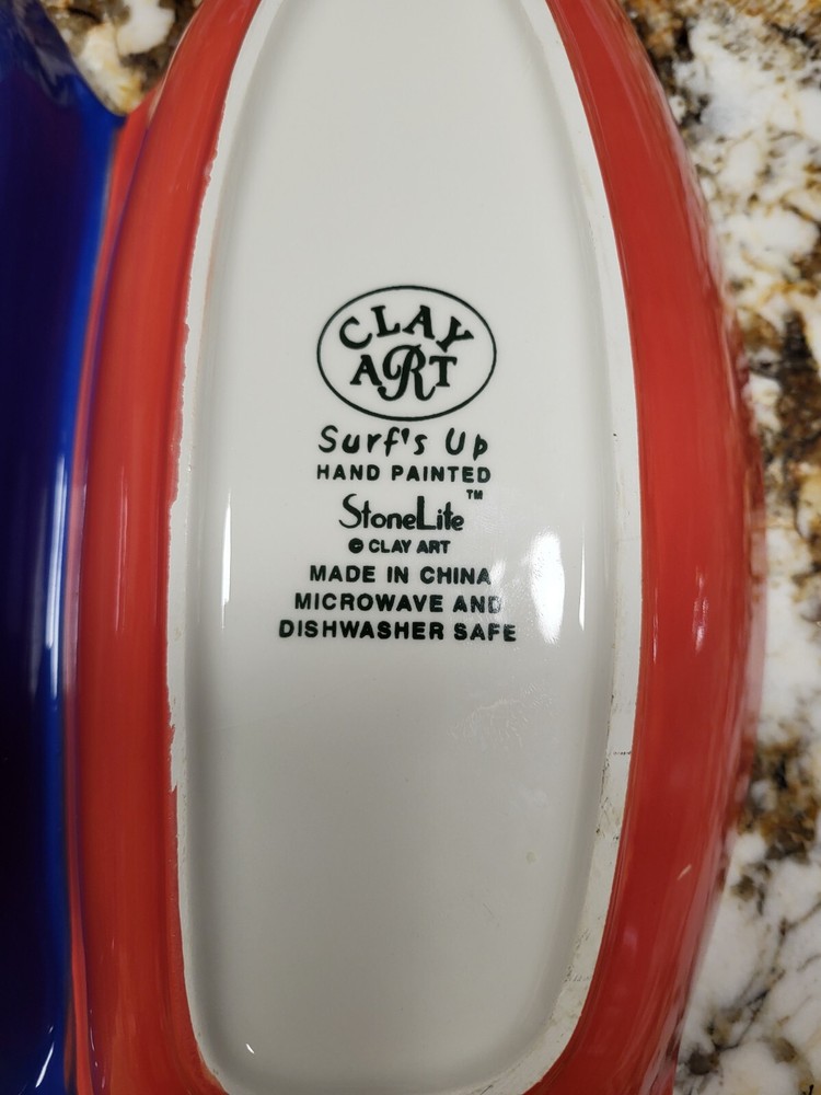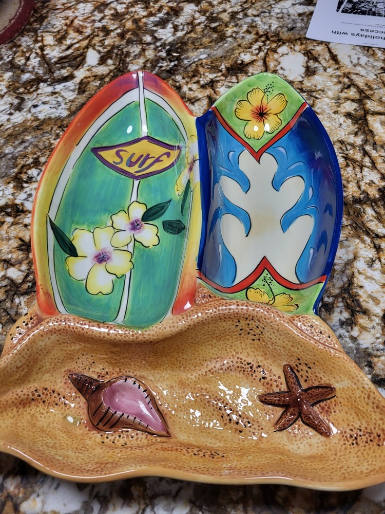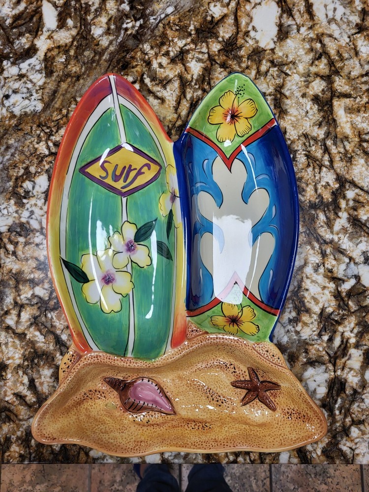 Get ready to ride the waves of fun with this Surfs Up Party Platter! This ceramic chip and dip platter is perfect for any occasion, whether you're having a casual game night or hosting a party. Measuring 16 inches in length and 12 inches in width, this platter is sure to impress your guests with its all-over surfing design and novelty shape. Crafted by Clay Art and made in China, this platter features three compartments for your favorite dips and chips. The glossy finish makes it easy to clean and both microwave and dishwasher safe. Its vintage/retro style will add a touch of nostalgia to your kitchen or dining room. So grab your board and get ready to make waves with this one-of-a-kind platter! Platter in great condition no damage.