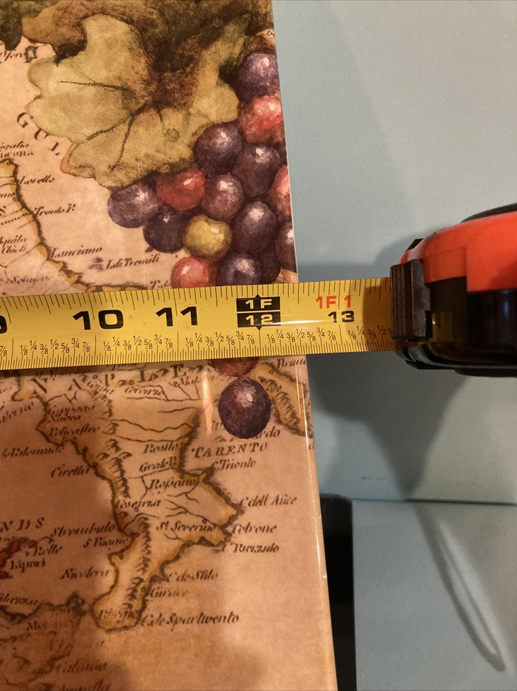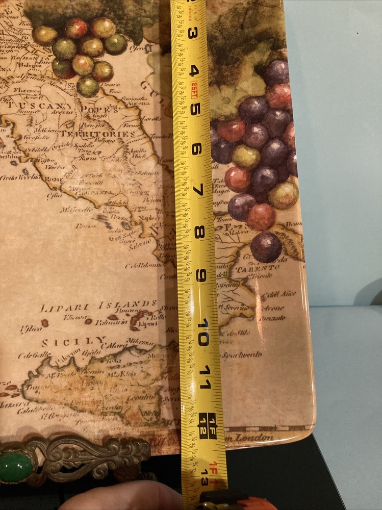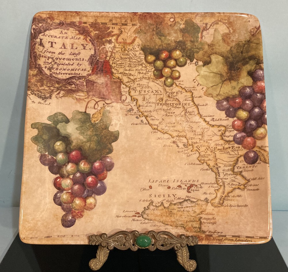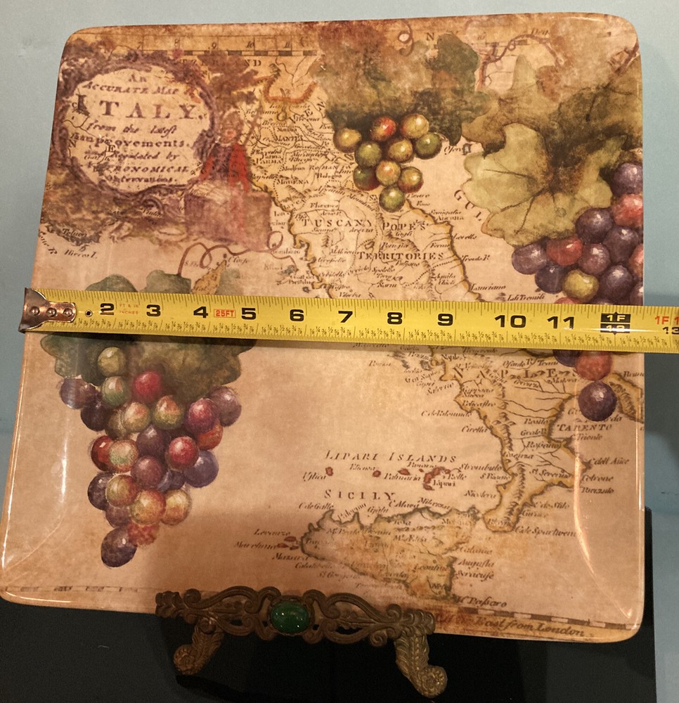 Add a touch of spring to your dining table with this beautiful Susan Winget Map of Italy Grapes platter. The large, square ceramic platter features a colorful pattern of grapevines and maps of Italy, making it perfect for any occasion. Measuring approximately 12 inches in length and width, with a depth of 2 inches, this platter is sure to impress. The glossy finish adds a touch of elegance to your table setting. Made in China, this platter is a must-have for any collector or lover of beautiful, high-quality dinnerware.
