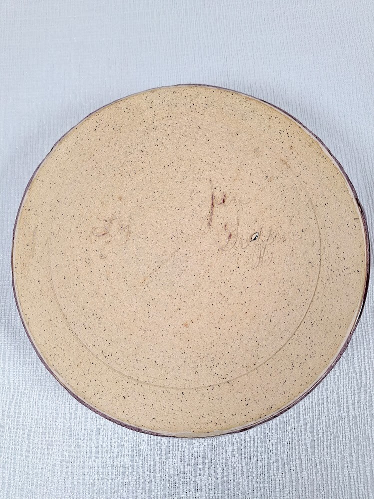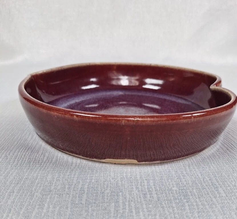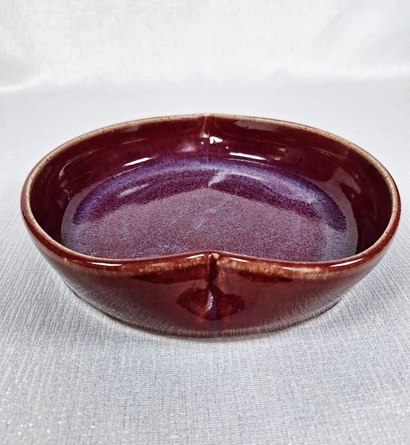 What a sweet pottery dish! A deep, reddish plum shade is over glazed with a thin film of light blue. And it's just the right size for serving or baking something for two. This is signed studio pottery, genuine enough to have a few imperfections, but lovely enough so they add to its handmade quality. A little missed glaze on the bottom rim is not a chip, but rather a firing blip. It is hard to see from the top of the dish. Measurements: 9.25 x 8 x 2 inches Weight: 1 lb, 13 oz. Shipping to North America only.