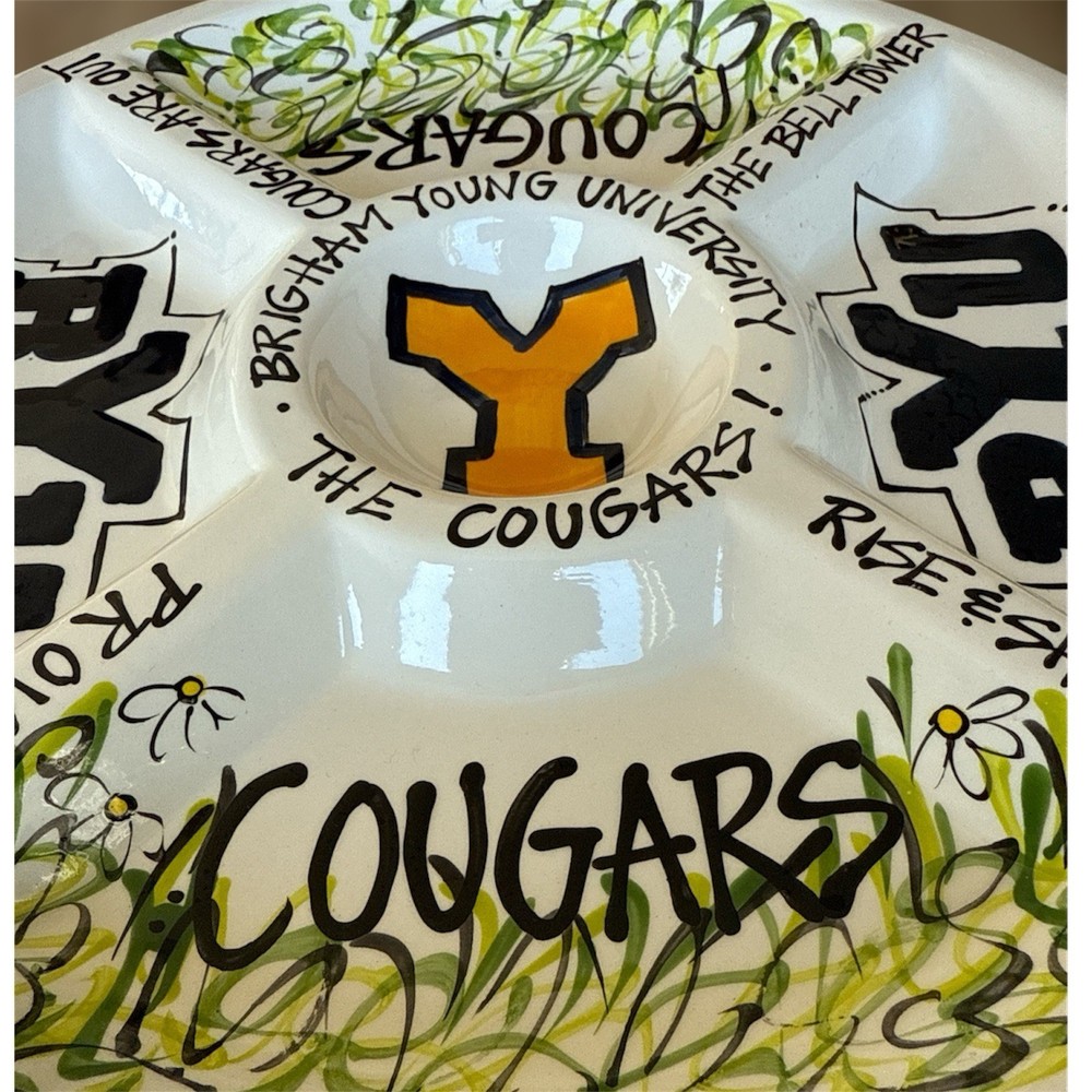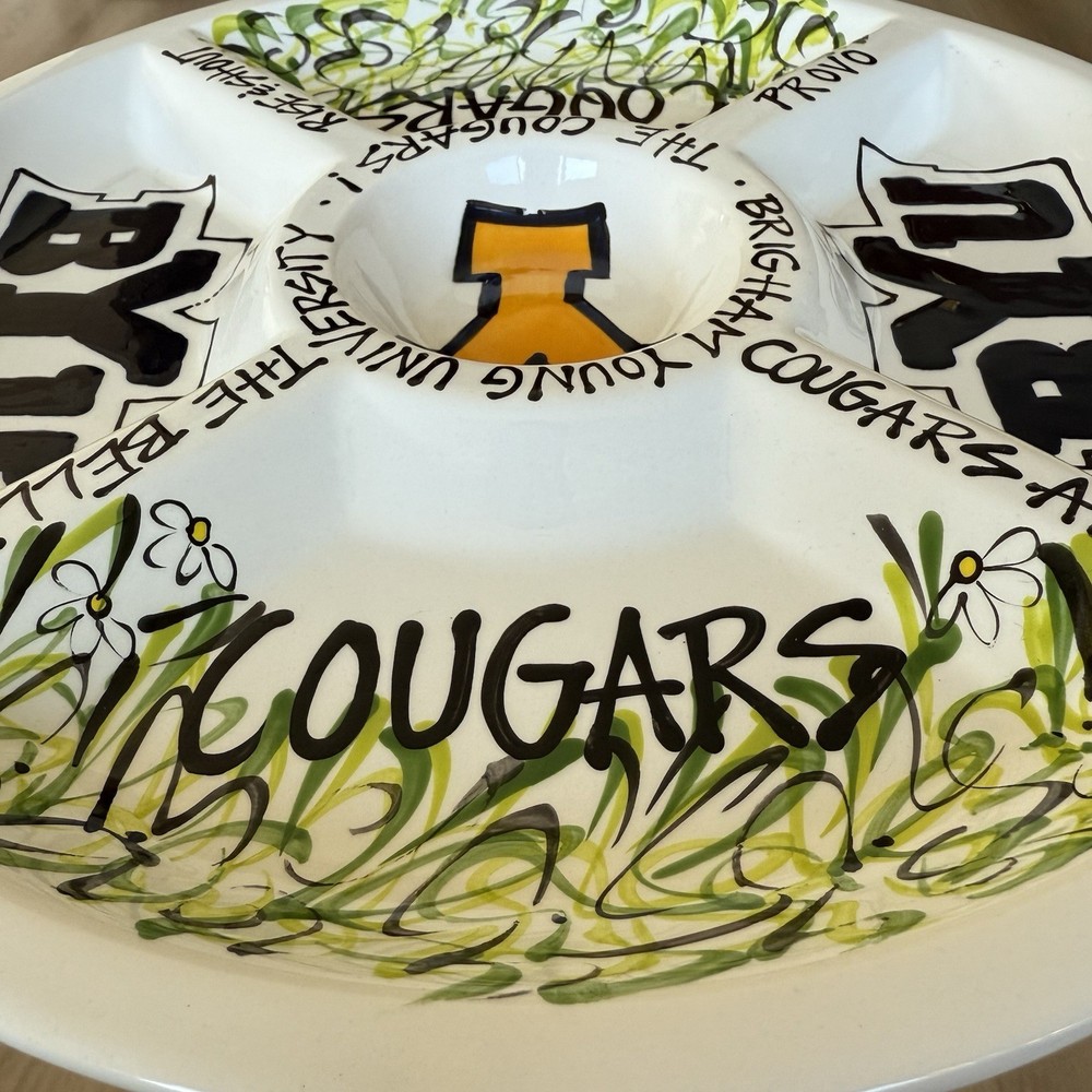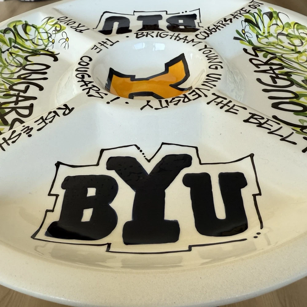 Show your love for the BYU Cougars with this amazing chips and dip platter from T Cabells Too. Featuring beautiful Magnolia Lane design, this platter is perfect for any football fan. The platter is of large size and is made of high-quality material, ensuring its durability for years to come. The white color of the platter perfectly complements the team's colors, making it a great addition to any fan's collection. Get your hands on this unique piece of fan memorabilia today! Perfect for tailgating and game day. For byu Brigham youn university cougars fan. Excellent condition.